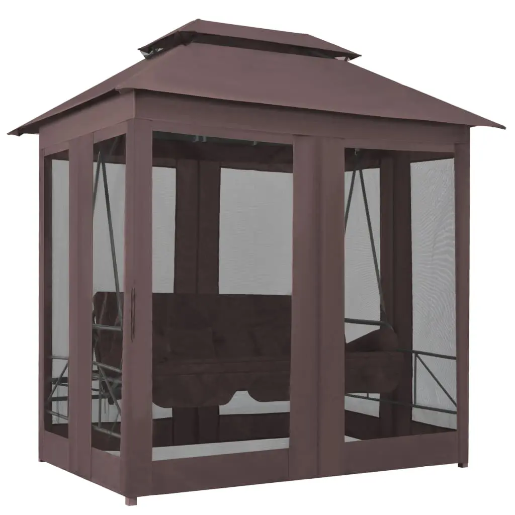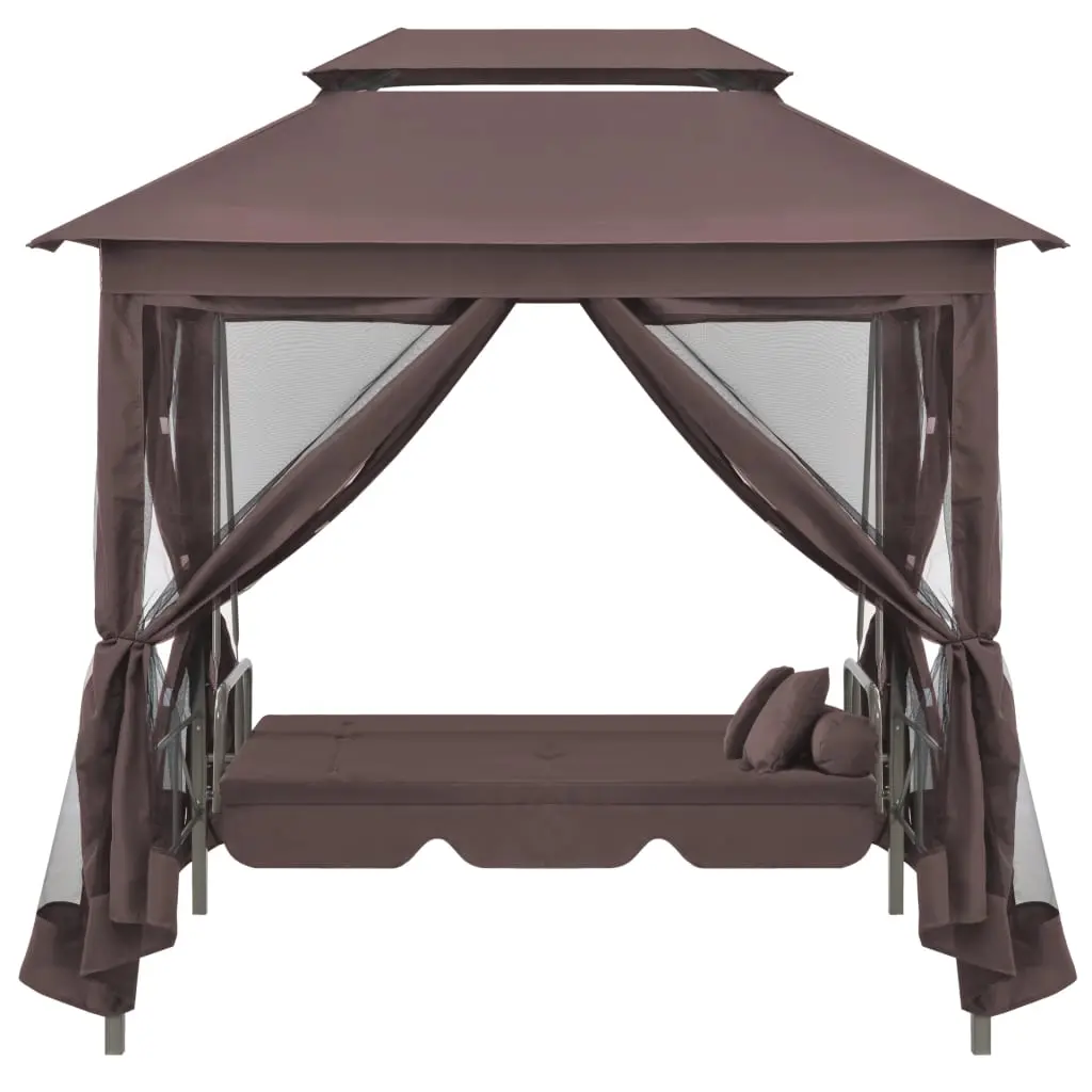 This stylish and spacious gazebo swing bench, featuring a spacious and stylish design, comfortably seats two persons and provides shade from the sun with its large canopy. Thanks to the fitted curtains with hook and loop fasteners, you can easily close all four sides to create an enclosed area. The closed mesh is perfect for keeping flying insects out and giving you a private retreat. The seat can be converted to a bed. Two rectangular pillows and two cylindrical pillows are included for added comfort. The durable steel frame has been given a corrosion-resistant powder-coated finish. The waterproof polyester cushion covers are removable for easy cleaning. Assembly is also really easy.