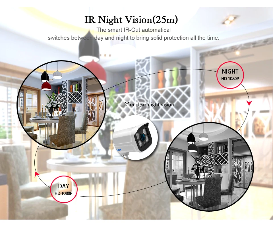 Built in IR-Cut filter with IR distance 25 meters, the smart IR-Cut anyomatical switches between day and night to bring solid protection all the time
