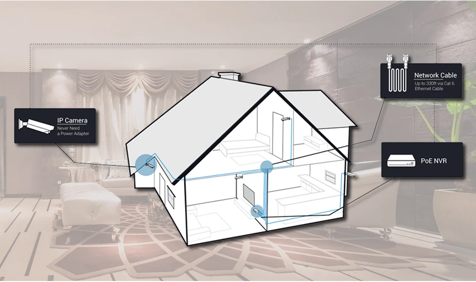 A real plug and play security system! With a single network cable connecting each IP camera to the NVR for both power supply and video singal transmission.