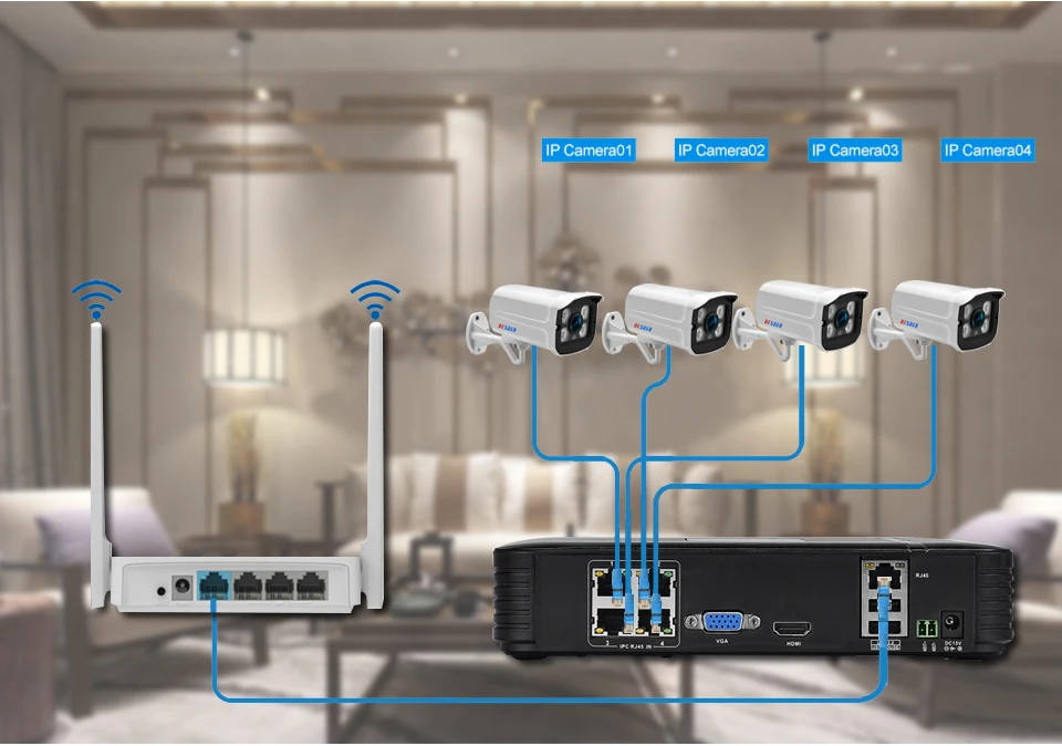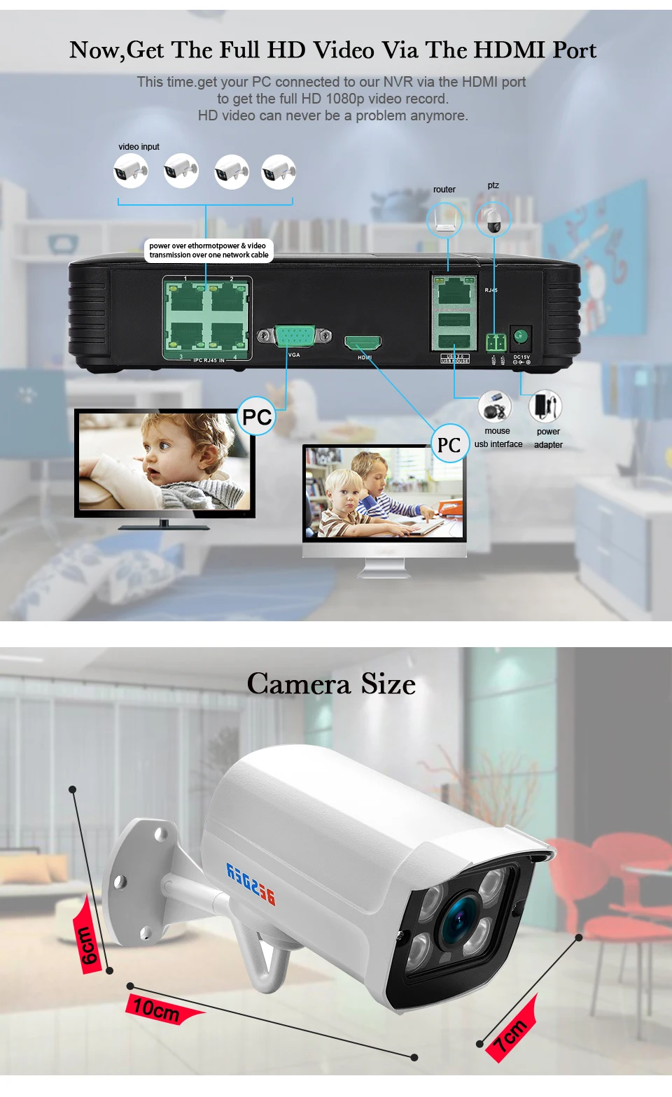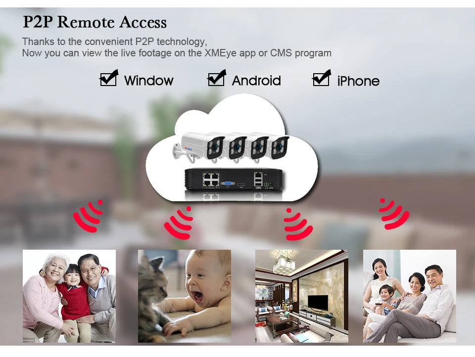 More Advantage Simplify installation and reduce This new POE (Power over Ethernet) camera is equipped with only one network cable to both provide power supply and transmit video signals. Equipped with only one network cable to both provide power supply and transmit video signals. This literally simplified the installation and reduced costs. Digital 1080P for crystal clear videos It is totally digital high definition with advanced image processing technology which brings your video back to life. Comparing with other analog system, BESDER POE system transmit digital signal and restore the most vivid images for you without distortion. Easy remote access Intuitive interface, convenient installation and easy remote control, this is all the advanced security system provides. Viewing on the monitor at home is no longer the exclusive way that we can get the video of our loved ones. Motion detection& E-mail alert With the motion detection function, the camera is able to detect any movements happened in your house and record it. Any movements can be detected and recorded via the motion detection function and alarming e-mail will be sent timely to leave you enough time for precautions. P2P cloud technology The P2P technology enhances the capacity, bandwidth and computing ability of the network system by allowing the entire client to provide network source. In conjunction with our DVR, users will enjoy a more flexible, reliable access to the recorded video without needing to download it like before. Thanks to the P2P cloud technology, users will enjoy a more flexible, reliable access to the recorded video without needing to download it like before. Loop recording& Playback As we know the storage space is limited. But loop recording could guarantee continuous recording yet cover the previous video when the memory if full by overwriting the unprotected video meanwhile the protected ones remain safety. HDMI and VGA interface choice of output port Our NVR provide two output ports: HDMI and VGA interface. Connect your TV or monitor to the corresponding port. Either way, you are guaranteed to get a crystal clear video of your home and office. Save installation cost with Power over Ethernet Each camera is connected with only one cable to NVR, through which it can transmit video image and get charged. This POE technology simplifies the security kit and makes it more convenient for you to use it.