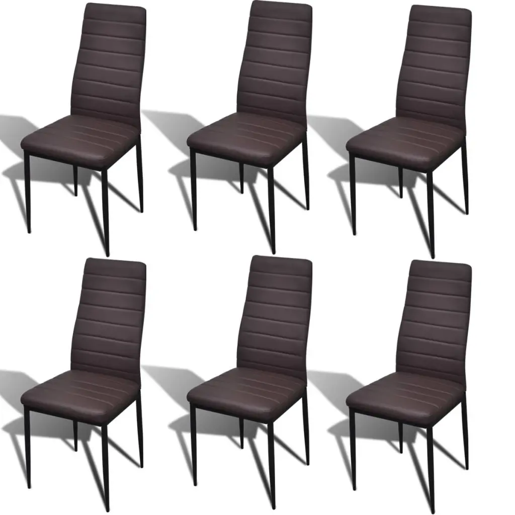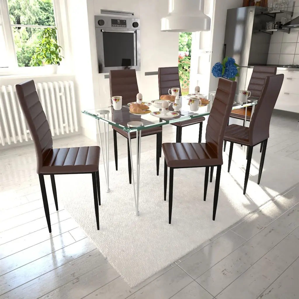 The sleek, modern dining set, consisting of 1 table and 6 high-quality chairs, will be a great choice for your dining room or kitchen. Its simple elegance will add a luxurious touch to any dinner. Thanks to the wear-resistant and stain-proof artificial leather and its thickly padded seat, the chair is very comfortable. The dining table with its tempered glass top features powder-coated steel and plastic legs, which make the table highly stable and durable. It is also very easy to clean with just a damp cloth. Delivery includes 1 glass table and 6 chairs.