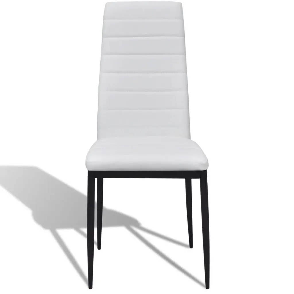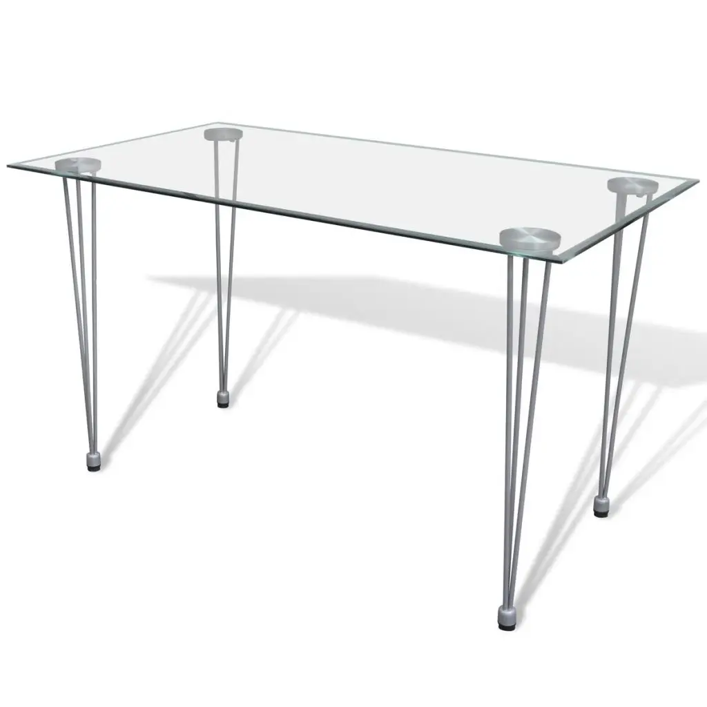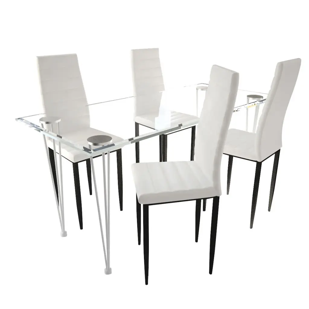 The sleek, modern dining set, consisting of 1 table and 4 high-quality chairs, will be a great choice for your dining room or kitchen. Its simple elegance will add a luxurious touch to any dinner. Thanks to the wear-resistant and stain-proof artificial leather and its thickly padded seat, the chair is very comfortable. The dining table with its tempered glass top features powder-coated steel and plastic legs, which make the table highly stable and durable. It is also very easy to clean with just a damp cloth. Delivery includes 1 glass table and 4 chairs.