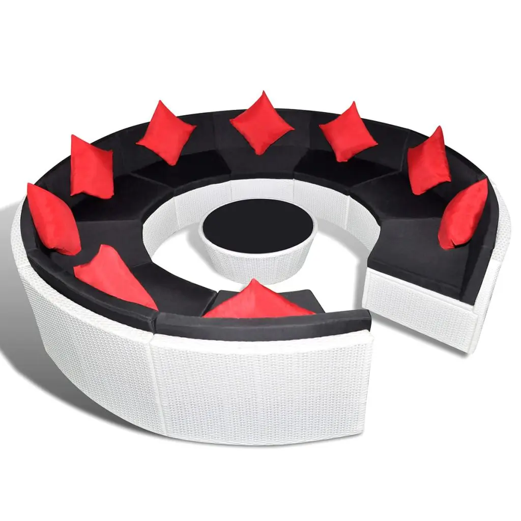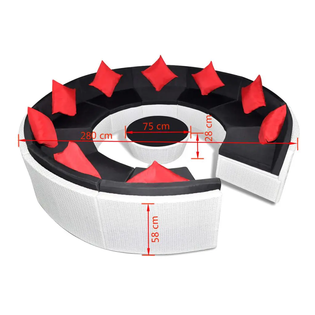 This round, rattan sofa set combines style and functionality, and will become the focal point of your garden or patio. The whole furniture set is designed to be used outdoors year-round. Thanks to the weather-resistant and waterproof PE rattan, the lounge set is easy to clean, hard-wearing and suitable for daily use. The seat set features a sturdy powder-coated steel frame, which is highly durable. It is also lightweight and modular, which makes it easy to move around to suit any setting. This set is delivered with highly comfortable, thickly padded seat and back cushions. The cushion covers are removable and washable. Delivery includes 9 sofa segments, 1 coffee table, 9 pillows and 18 cushions. Note: We recommend covering the set in the rain, snow and frost.