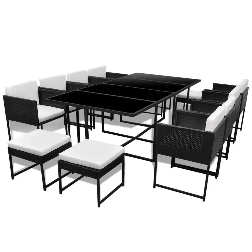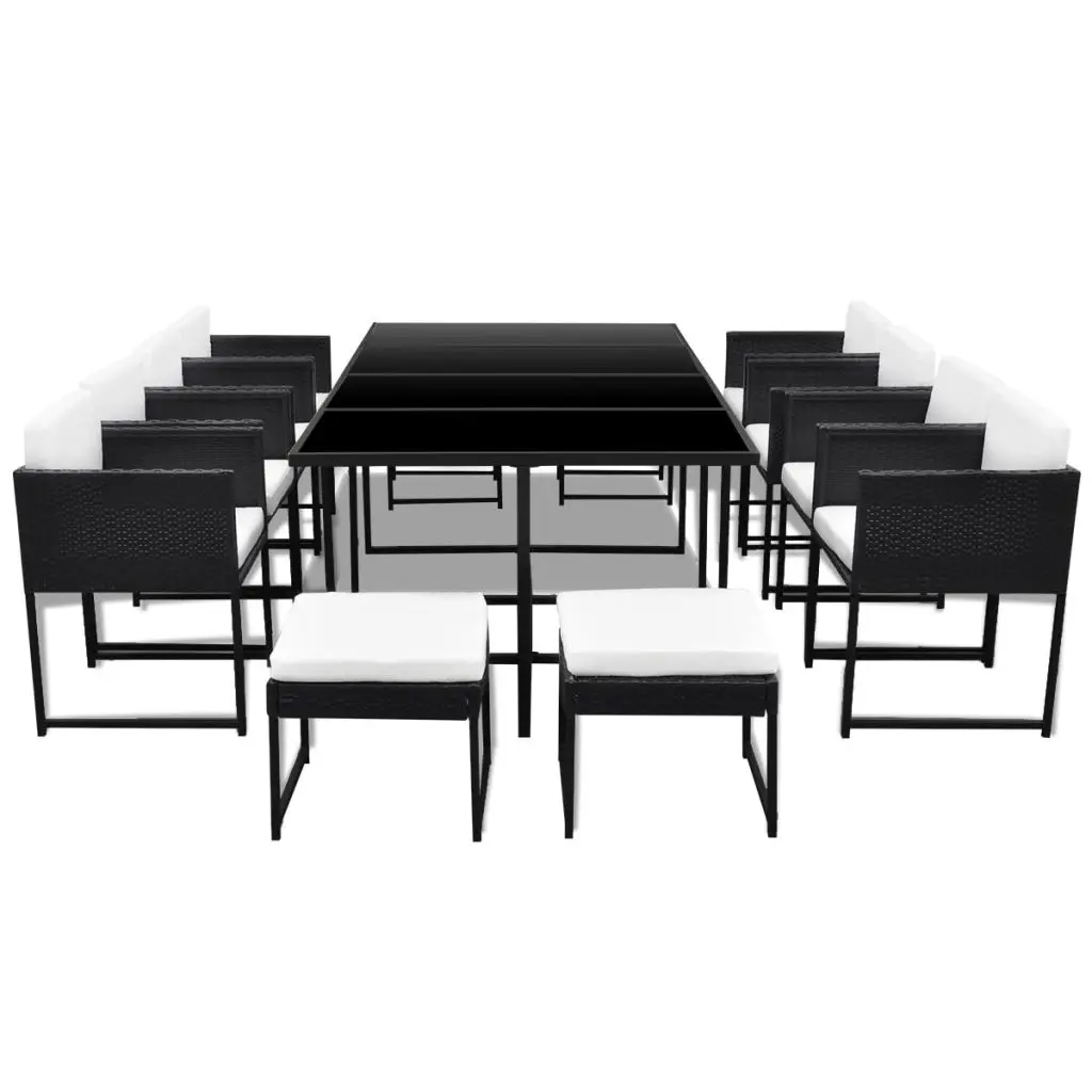 This 12-person rattan dining set has an elegant, modern design and consists of 1 table, 8 chairs and 4 stools. Our rattan garden furniture set will be the focal point of your garden or patio! The powder-coated steel frames make the table and chairs strong and sturdy, and thanks to their lightweight constructions, all items are easy to move around. Thanks to the weather-resistant PE rattan, the dining set is easy to clean. The tempered glass table top is also easy to clean with a damp cloth. The thick, soft cushions with cotton fibre filling are highly comfortable and made of polyester. The removable and washable covers are equipped with zips. The stools can be placed neatly underneath the table when not in use to save space. Delivery includes 1 table with glass top, 8 rattan chairs, 4 stools, 12 seat cushions and 8 back cushions. Note: We recommend covering the set in the rain, snow and frost.