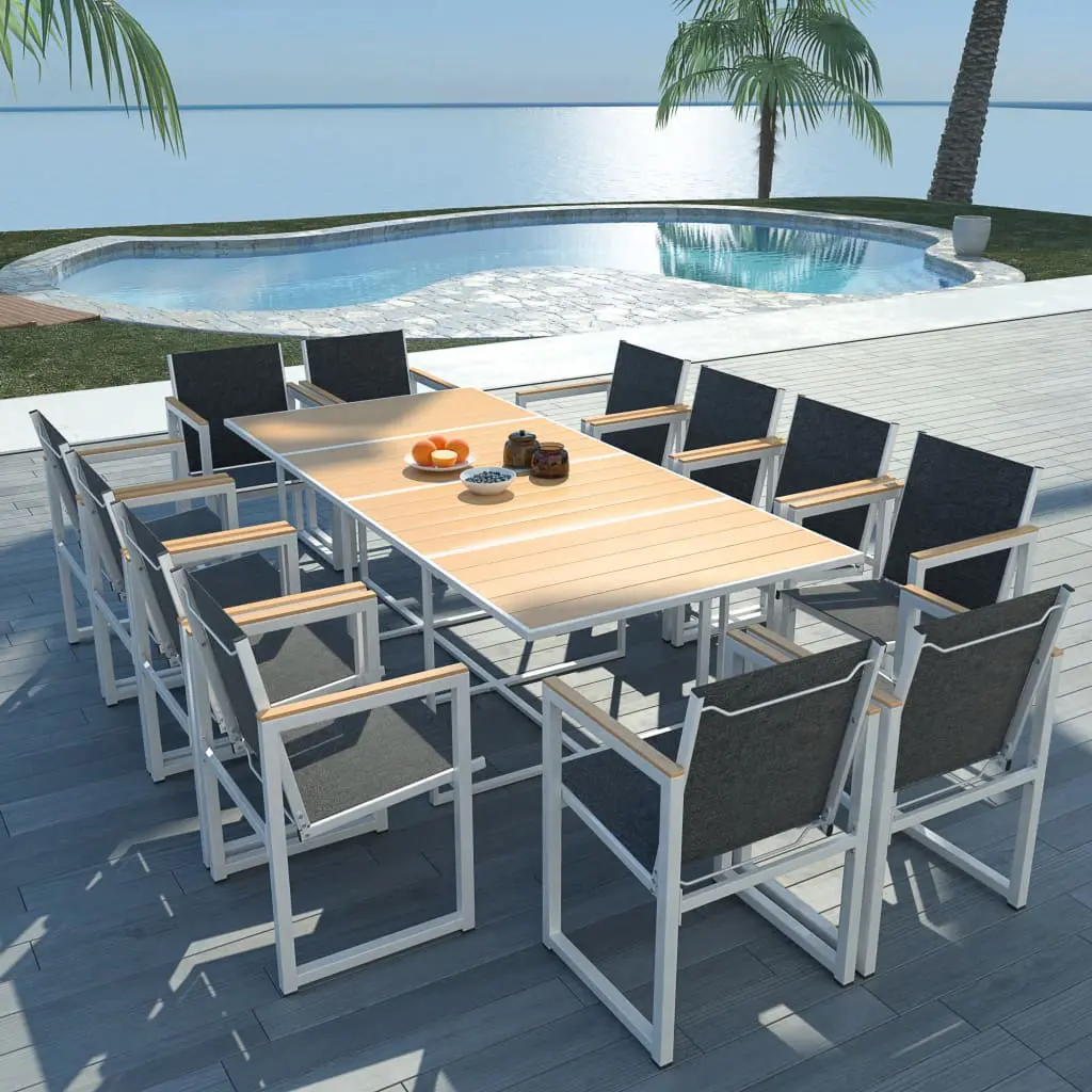 This outdoor dining set will be a great choice for al fresco dining in the garden, on the terrace or patio. This dining set has a powder-coated 100% aluminium frame, making the table and chairs lightweight and easy to move around. The tabletop is made of high-quality WPC, which makes it sturdy and durable. Thanks to the strong textilene fabric, our dining chairs are weather resistant and easy to clean. These chairs can be conveniently stored underneath the table to save space when not in use. Delivery includes 1 table and 12 chairs. Assembly is easy.