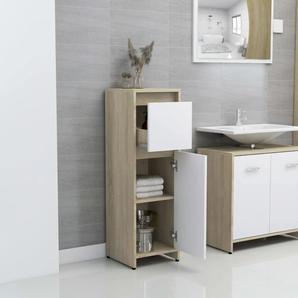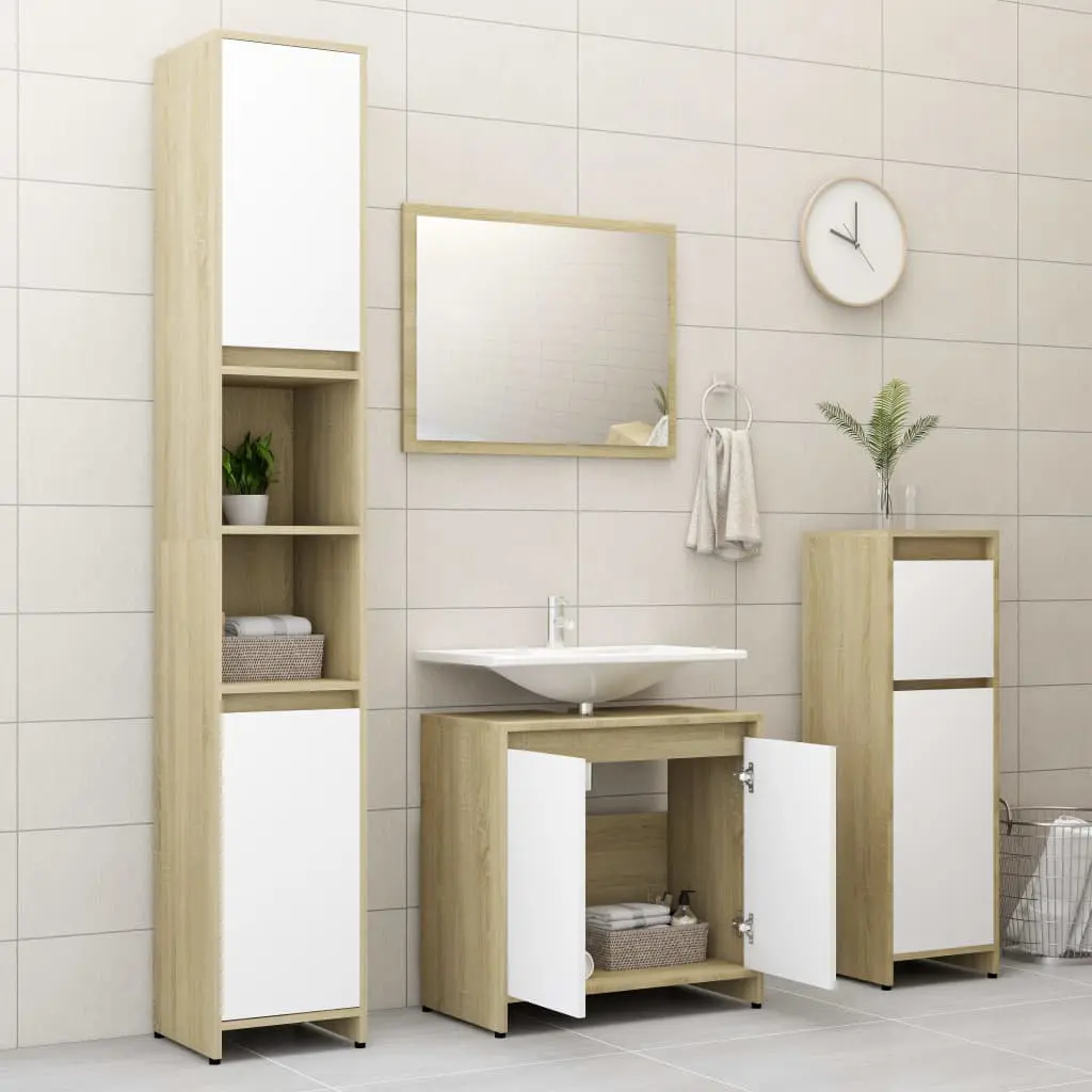 This stylish bathroom furniture set, featuring 1 medium cabinet, 1 under basin cabinet and 1 mirror, creates additional storage space for your bathroom with a stunning and neat appearance. Made of premium board, this set is durable and stable. The chic medium cabinet has 2 compartments, 1 drawer and 1 door, offering spacious space to store items in your bathroom. The basin cabinet has 1 compartment and 2 doors, providing ample space to store your toiletries, beauty products and various kinds of smaller items. You can even organise combs, cosmetics, toothbrushes and toothpaste in the shelves conveniently within reach. The mirror adds an excellent appearance to your existing home decor. Additionally, this bathroom set is easy to clean with a damp cloth.