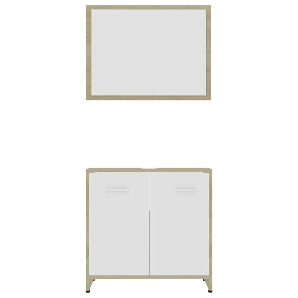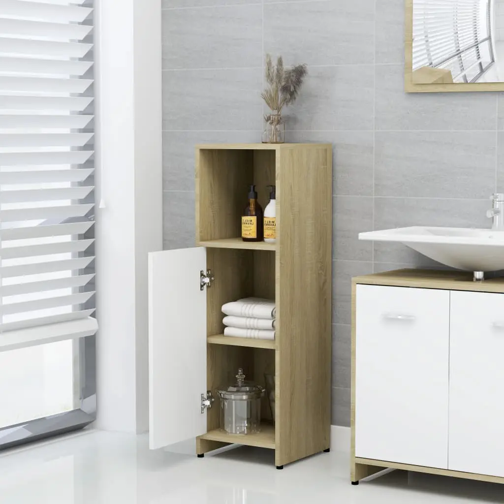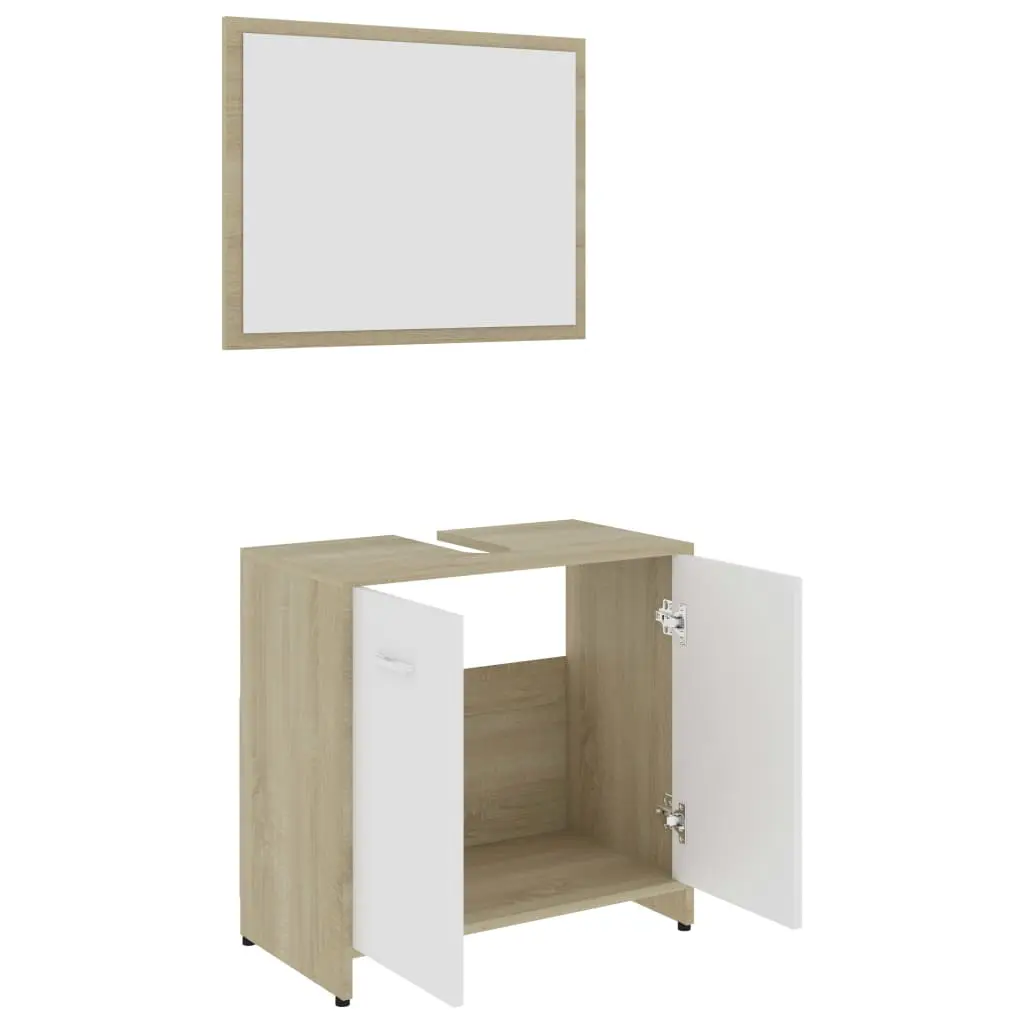 This stylish bathroom furniture set, featuring 1 medium cabinet, 1 under basin cabinet and 1 mirror, creates additional storage space for your bathroom with a stunning and neat appearance. Made of premium board, this set is durable and stable. The chic medium cabinet has 3 compartments and 1 door, offering spacious space to store items in your bathroom. The basin cabinet has 1 compartment and 2 doors, providing ample space to store your toiletries, beauty products and various kinds of smaller items. You can even organise combs, cosmetics, toothbrushes and toothpaste in the shelves conveniently within reach. The mirror adds an excellent appearance to your existing home decor. Additionally, this bathroom set is easy to clean with a damp cloth.