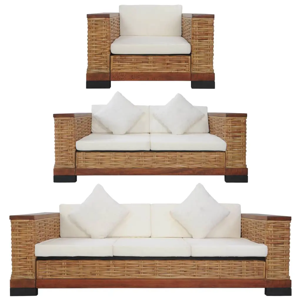 This rattan sofa set combines style and functionality, and will make a great addition to your home. Thanks to the genuine rattan material, the set is easy to clean, hardwearing and suitable for daily use. It features a sturdy wooden frame, which is highly durable and stable. The thick seat and back cushions are considerably conformable and also washable thanks to their removable covers. In addition, the wide armrests add to your seating comfort. Delivery includes an armchair, a 2-seater sofa, a 3-seater sofa, 6 seat cushions, 5 back cushions and 4 pillows.