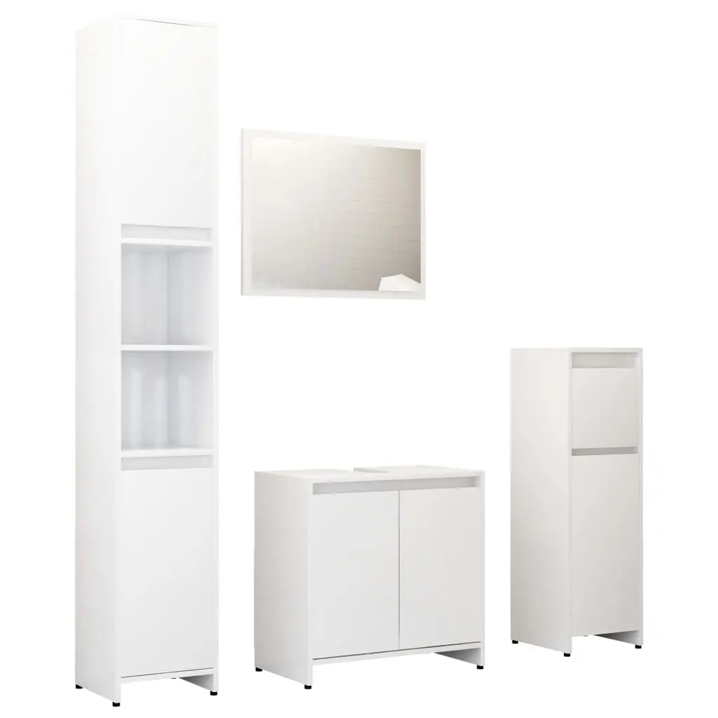This stylish bathroom furniture set, featuring 1 high cabinet, 1 medium cabinet, 1 under basin cabinet and 1 mirror, creates additional storage space for your bathroom with a stunning and neat appearance. Made of premium board, this set is durable and stable. The chic high cabinet has 6 compartments and 2 doors while the medium cabinet has 2 compartments, 1 drawer and 1 door. Both offer spacious space to store your essential items in your bathroom. The basin cabinet, featuring 1 compartment and 2 doors, provides ample space to store your toiletries, beauty products and smaller items. You can even place combs, cosmetics, toothbrushes, toothpaste, etc., neatly organised and within reach. The mirror adds a unique appearance to your existing home decor. Additionally, this bathroom set is easy to clean with a damp cloth.
