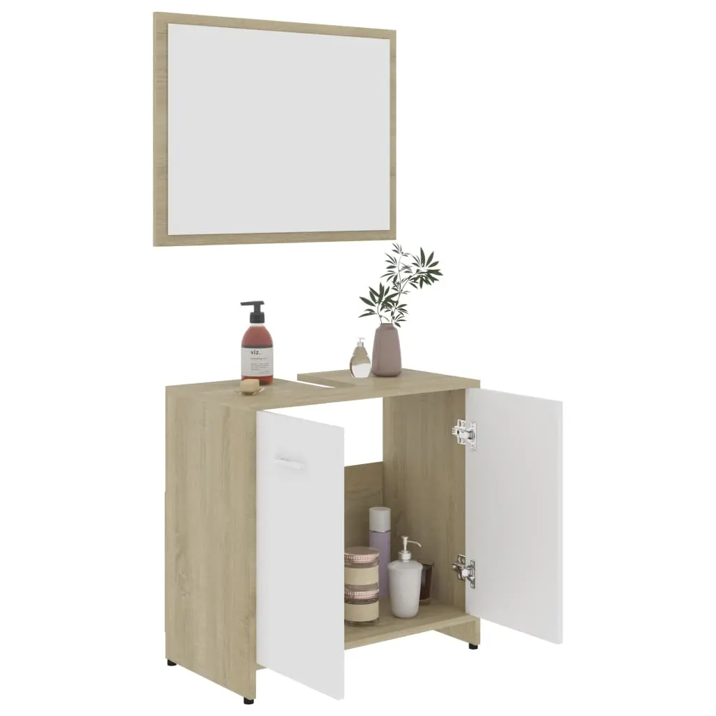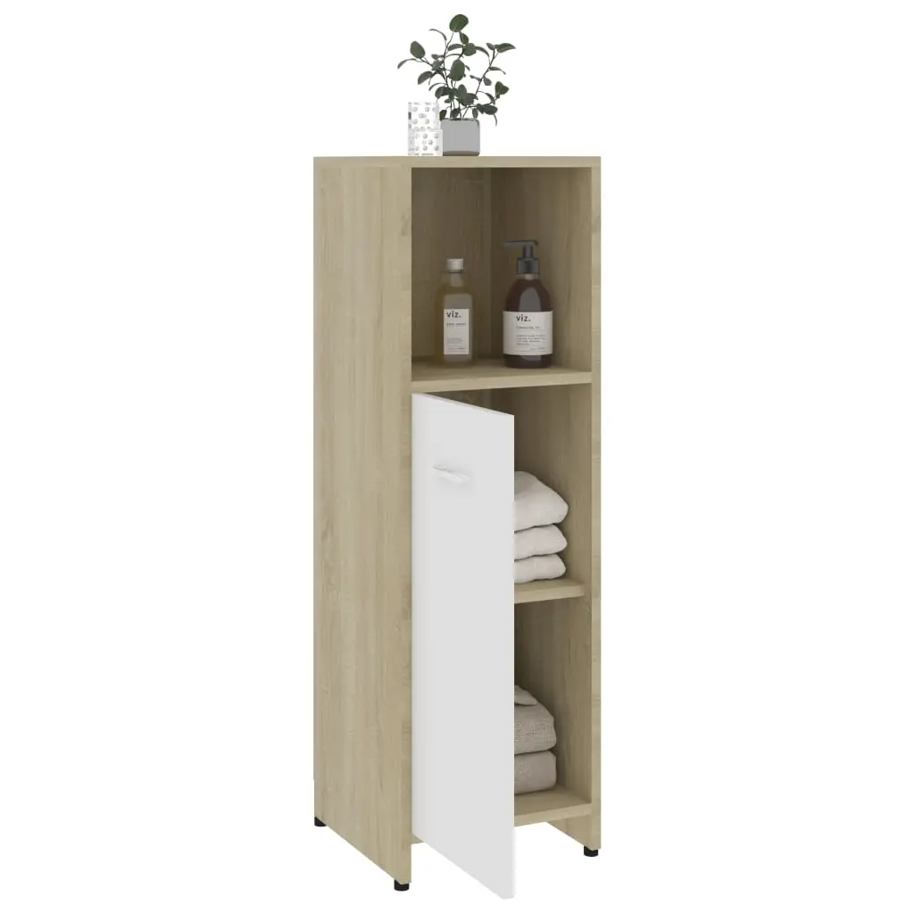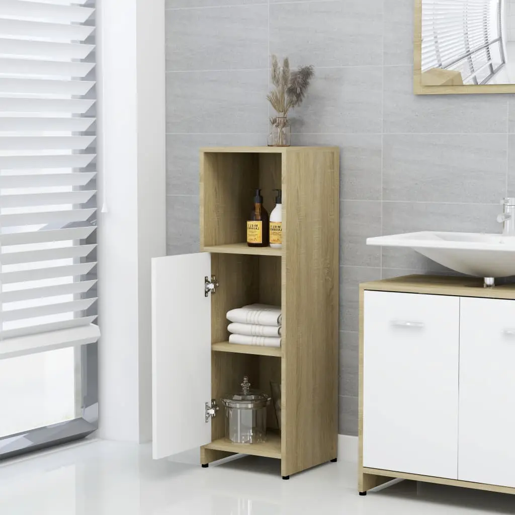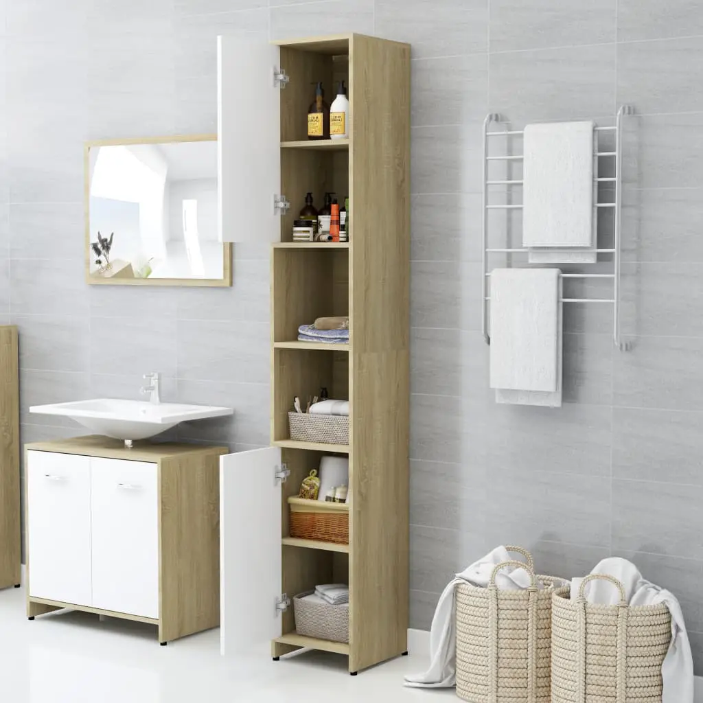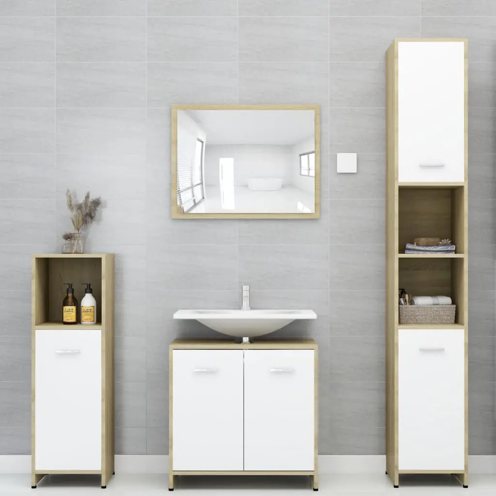 This stylish bathroom furniture set, featuring 1 high cabinet, 1 medium cabinet, 1 under basin cabinet and 1 mirror, creates additional storage space for your bathroom with a stunning and neat appearance. Made of premium board, this set is durable and stable. The chic high cabinet has 6 compartments and 2 doors while the medium cabinet has 3 compartments and 1 door. Both offer spacious space to store your essential items in your bathroom. The basin cabinet, featuring 1 compartment and 2 doors, provides ample space to store your toiletries, beauty products and smaller items. You can even place combs, cosmetics, toothbrushes, toothpaste, etc., neatly organised and within reach. The mirror adds a unique appearance to your existing home decor. Additionally, this bathroom set is easy to clean with a damp cloth.