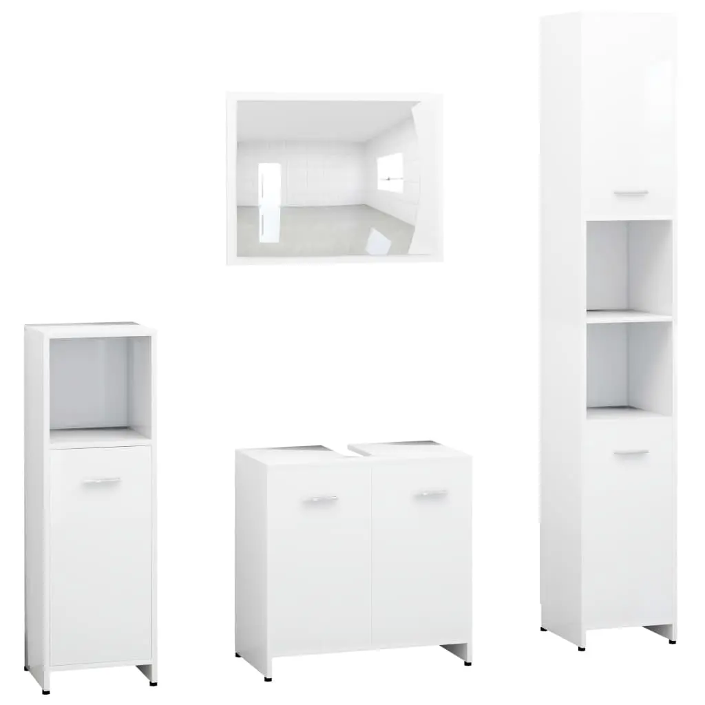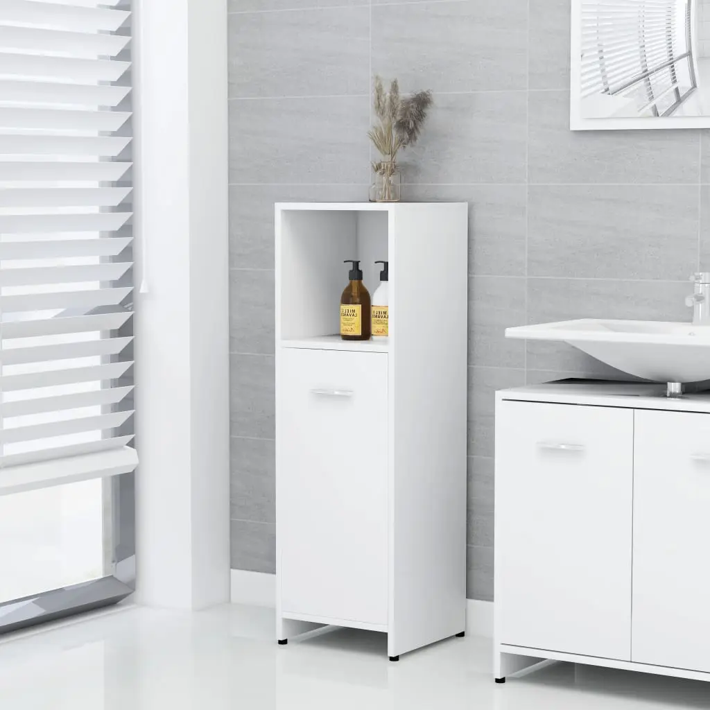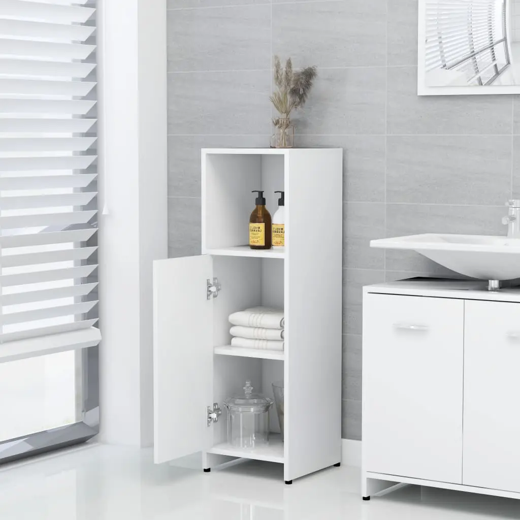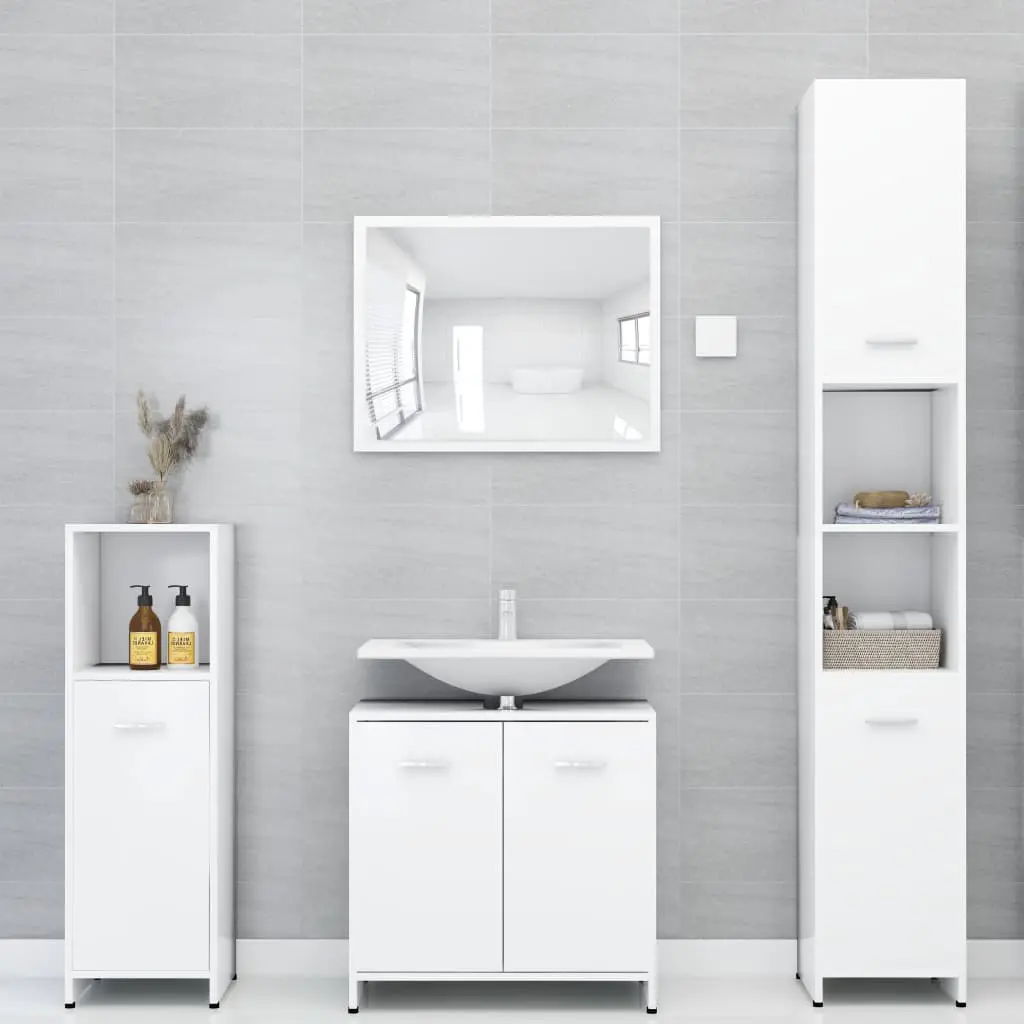 This stylish bathroom furniture set, featuring 1 high cabinet, 1 medium cabinet, 1 under basin cabinet and 1 mirror, creates additional storage space for your bathroom with a stunning and neat appearance. Made of premium board, this set is durable and stable. The chic high cabinet has 6 compartments and 2 doors while the medium cabinet has 3 compartments and 1 door. Both offer spacious space to store your essential items in your bathroom. The basin cabinet, featuring 1 compartment and 2 doors, provides ample space to store your toiletries, beauty products and smaller items. You can even place combs, cosmetics, toothbrushes, toothpaste, etc., neatly organised and within reach. The mirror adds a unique appearance to your existing home decor. Additionally, this bathroom set is easy to clean with a damp cloth.