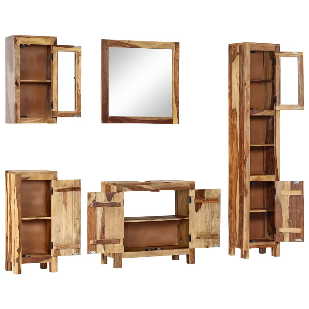 This retro-style wooden bathroom set will add a touch of rustic charm to your bathroom. Crafted from solid sheesham wood, the set frames are exceedingly sturdy, stable and durable. Sheesham, also known as rosewood or palisander, is a tropical hardwood famous for its rich grain. The exquisite craftsmanship and the beautiful sheesham wood grains make every piece of furniture unique and slightly different from the next. The vanity cabinet has been designed to cover your washbasin’s plumbing. Additionally, the tall cabinet, side cabinet as well as the wall cabinet provide ample storage space for keeping your bathroom supplies neatly organised and within reach. Assembly is easy. Delivery includes 1 vanity cabinet, 1 tall cabinet, 1 side cabinet, 1 wall cabinet and 1 mirror. Important note: Colours and wood grains vary from piece to piece, making each of our furniture unique and slightly different from the next; the delivery is random.