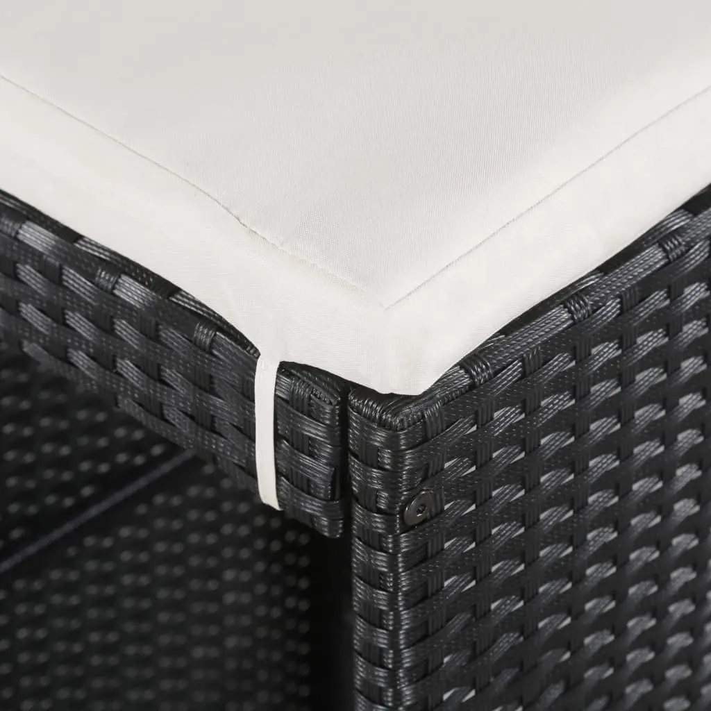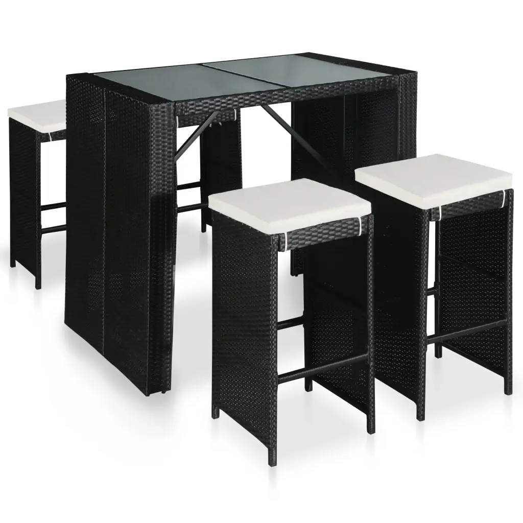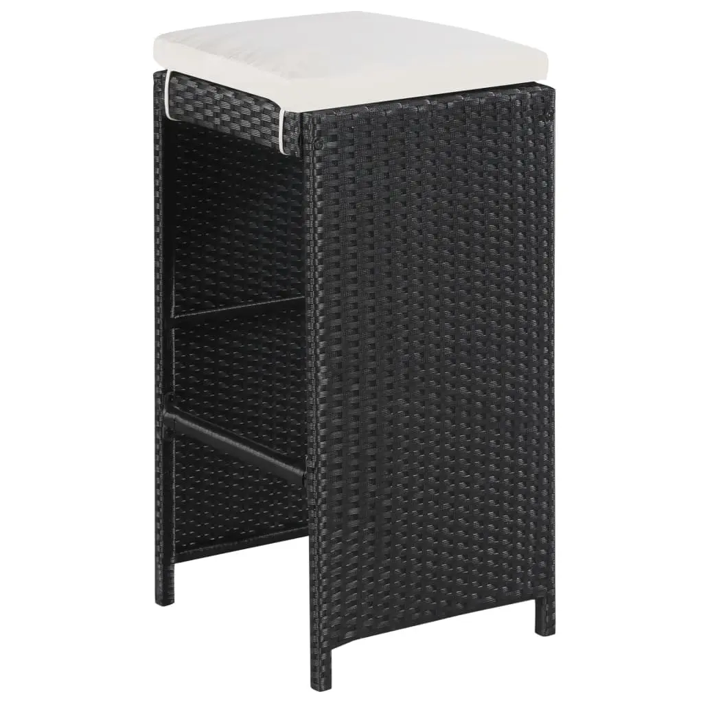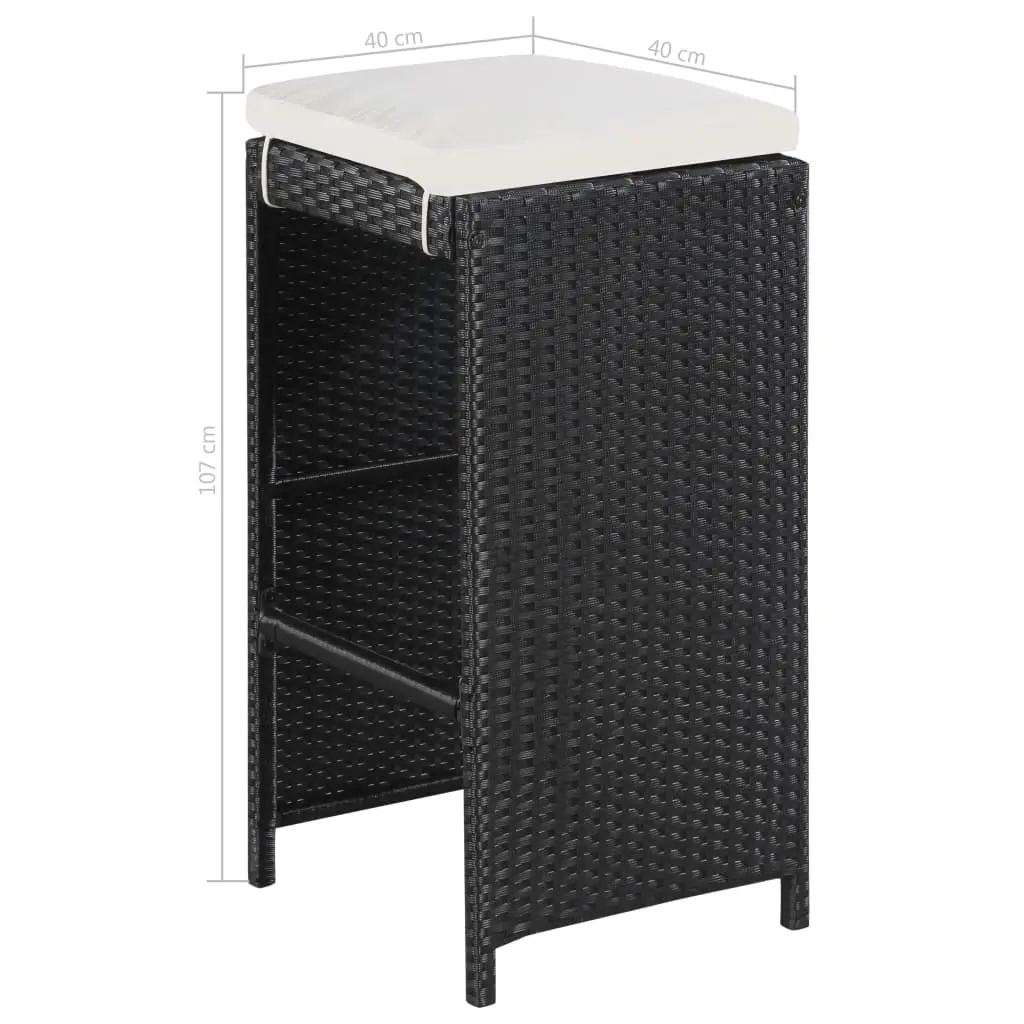 This poly rattan bar set, consisting of 1 bar table, 4 bar stools and 4 seat cushions, will become an eye-catcher in your garden. Thanks to the water-resistant PE rattan, the patio bar set is easy to clean, hardwearing and suitable for daily outdoor use. It comes with a contemporary table to match our elegant stools. The powder-coated steel frames make the set sturdy and stable, but since the construction is also lightweight, all items are easy to move around to suit any setting. It is also delivered with highly comfortable, thickly-padded seat cushions for the ultimate comfort. The low-maintenance polyester covers can also be removed and washed. This set is easy to assemble. Note: We recommend covering the set during rain, snow and frost for its best service to last.
