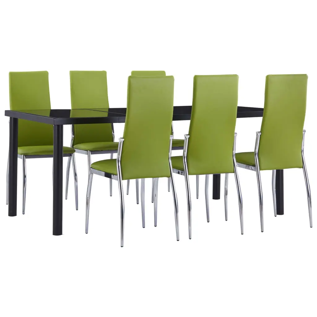 Featuring a stylish and modern design, our dining set is perfect to go with any homes, dining areas, or commercial restaurants. Its clean and contemporary design will complement any interior decor. The table has a smooth tempered glass tabletop that is easy to clean with just a damp cloth. The powder-coated metal frame contributes to its solid construction, bringing great stability and durability. The chairs are upholstered in a soft faux leather and thickly padded to provide maximum comfort. Its ergonomic design makes the dining chair exceedingly comfortable to nestle. Additionally, thanks to the chromed metal frame, the chairs are considerably sturdy and stable. This dining set is easy to assemble. Our dinner set is ideal for hosting a feast to your family and friends. Delivery includes a table and 6 chairs.
