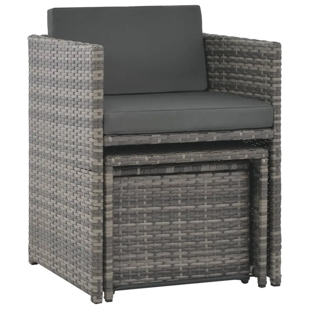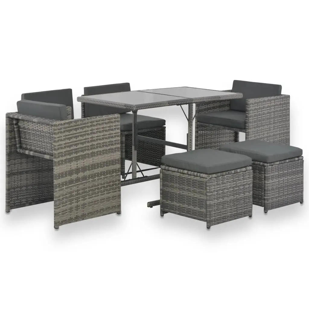 This poly rattan dining set will make a great addition to your outdoor living space. It will add a touch of modern elegance to your patio, balcony or garden with its understated yet stylish design. The set is made of high-quality, weather-resistant PE rattan which makes it easy to clean, hard-wearing and suitable for daily use. The powder-coated steel frame makes the set very sturdy and durable. The set is easy to move around due to the lightweight construction. The thickly-padded chair cushions make the set more comfortable. The cushion covers are removable and washable. Chairs and footrests can be stored underneath the table for saving space. The set is easy to assemble. Delivery includes 1 table, 4 chairs, 2 footrests and 10 cushions. Note: We recommend covering the set during rain, snow and frost for its best service to last.
