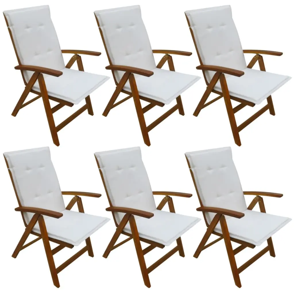 This stylish and contemporary wooden dining set will add a luxurious touch to any decor. Our wooden garden furniture set will be the focal point of your garden, terrace or patio. The dining set is made of high-quality acacia wood, a tropical hardwood, which is weather-resistant and suitable for outdoor use. The oil-finished surface is also easy to clean. In addition, the chairs’ backrests can be adjusted in 5 positions for added comfort. This set is delivered with highly comfortable, thickly padded cushions. The cushion covers are removable and washable. Assembly is easy. Delivery includes 1 table, 6 folding chairs and 6 cushions.