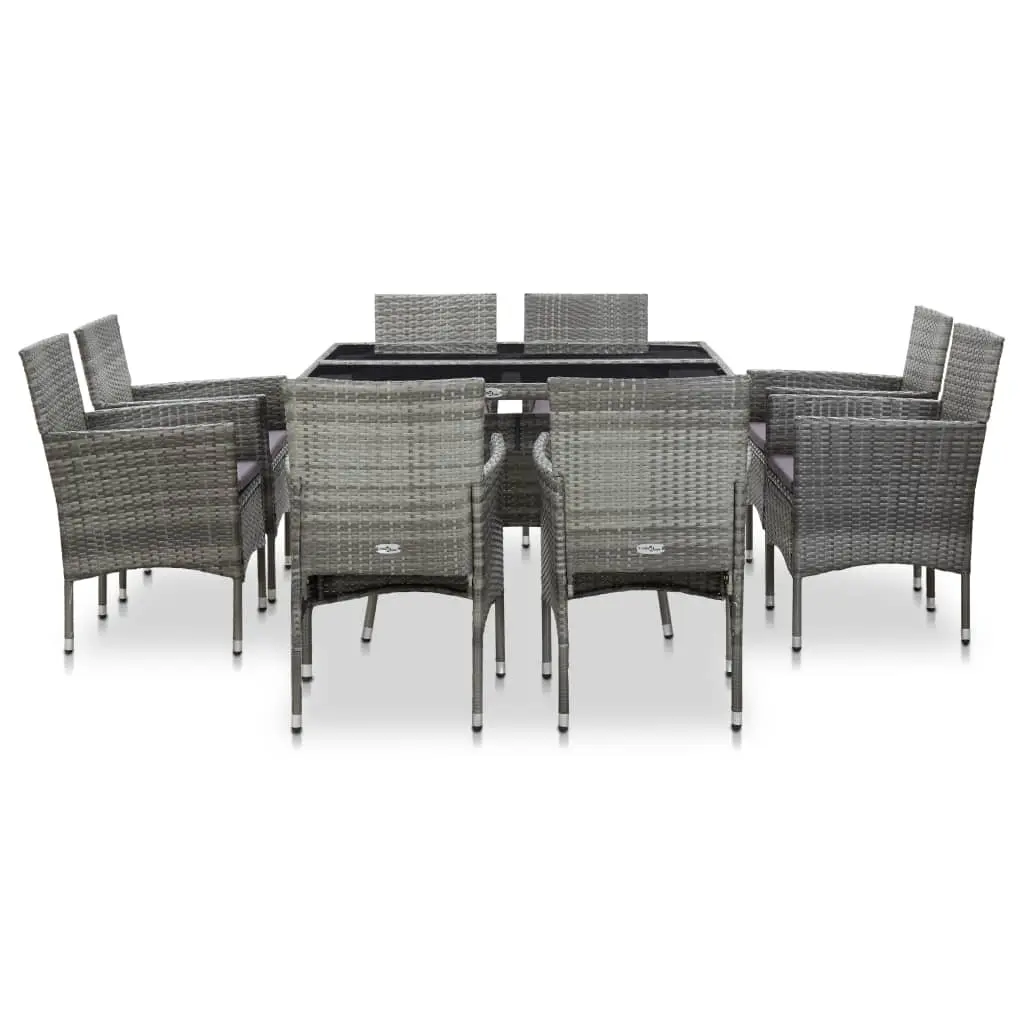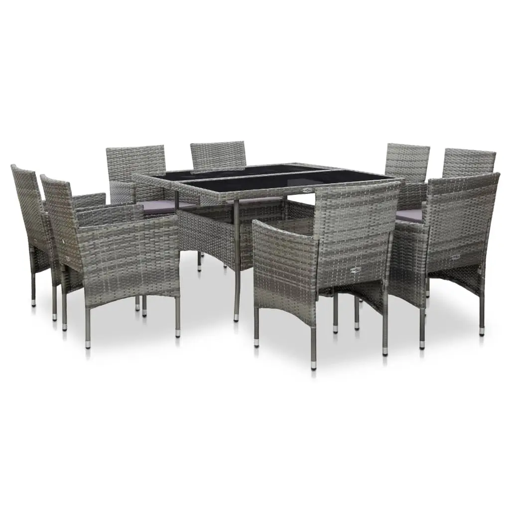Enjoy family gatherings in breeze with our 9 piece dining set! This dining set can effortlessly accommodate the needs of your guests while creating perfect outdoor dining setting! Made of UV protected PE rattan with strong steel frame in powder coating, this dining set is weather resistant and sturdy for long years of reliable use. The reinforced tempered glass top creates a smooth and easy to clean surface. This set can accommodate up to 8 people without the crowded feeling. Each seat comes with a removable thickly padded cushion for added comfort in your lounging time. All cushion covers are removable with zipped design. Additionally, the lightweight rattan construction makes each piece easy to move, rearrange and transport. Note: We recommended that you cover the set during rain, snow, frost or other harsh weather to prolong its life span.