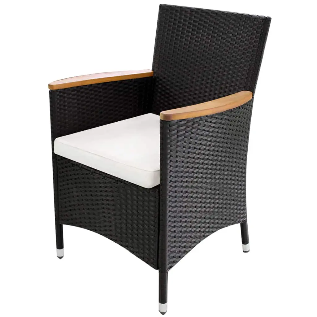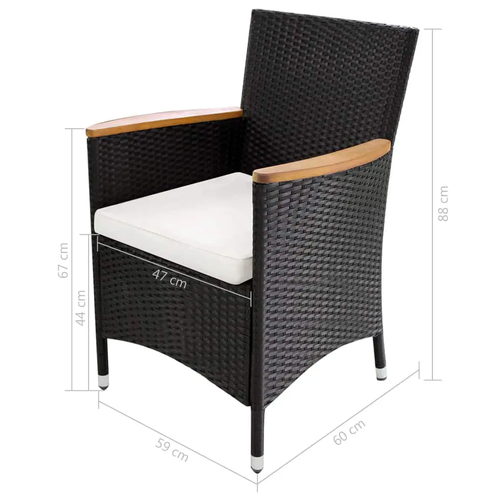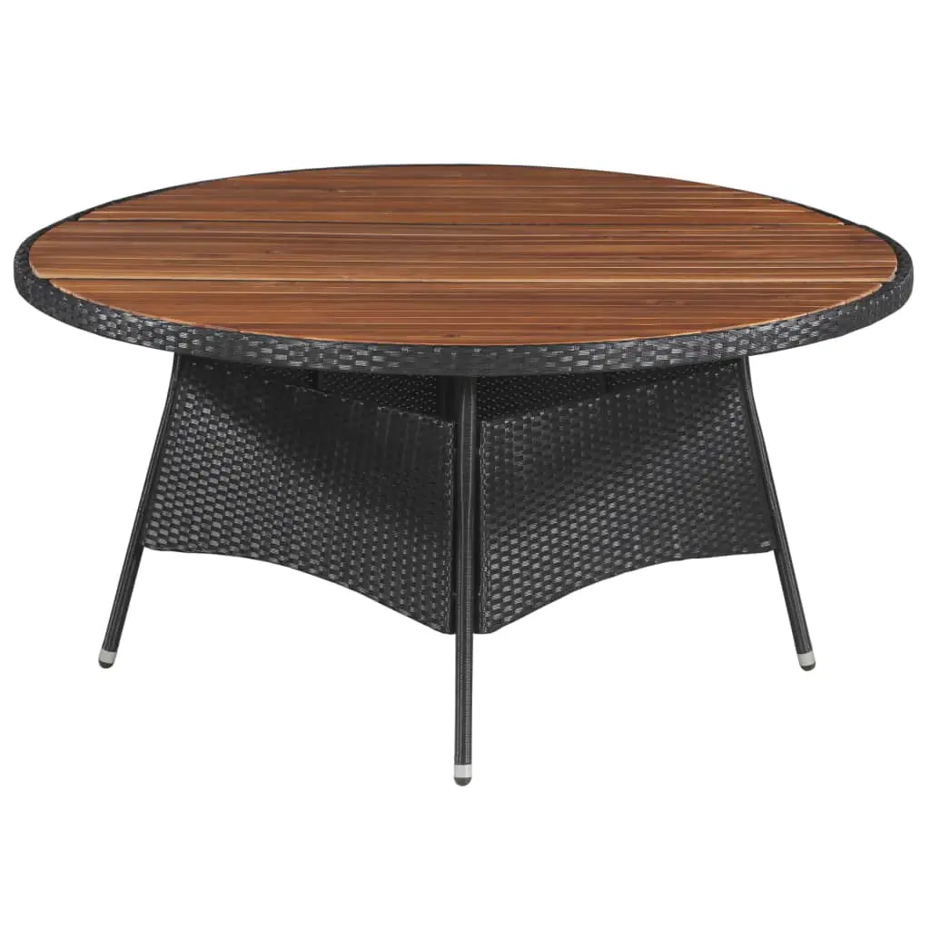 - Material: PE (polyethylene) rattan + solid acacia wood tabletop and armrests + powder-coated steel frame