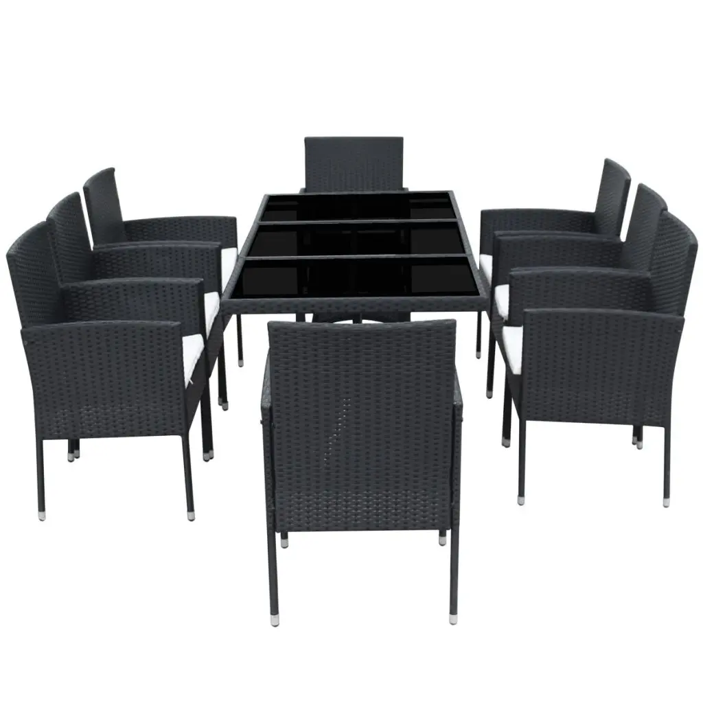 - Delivery includes 1 table with glass top, 8 chairs and 8 removable seat cushions
