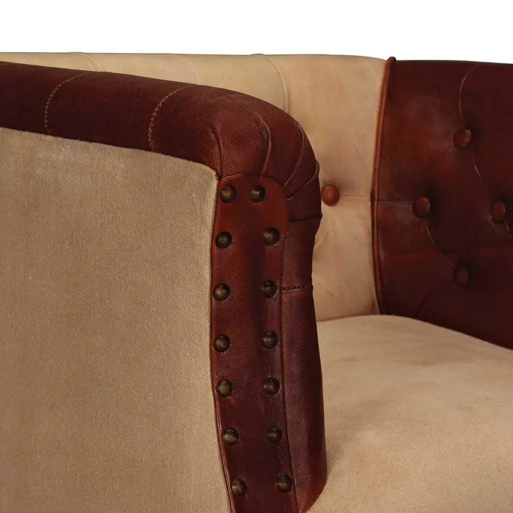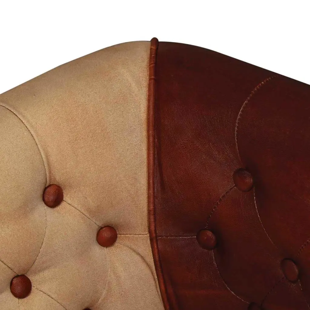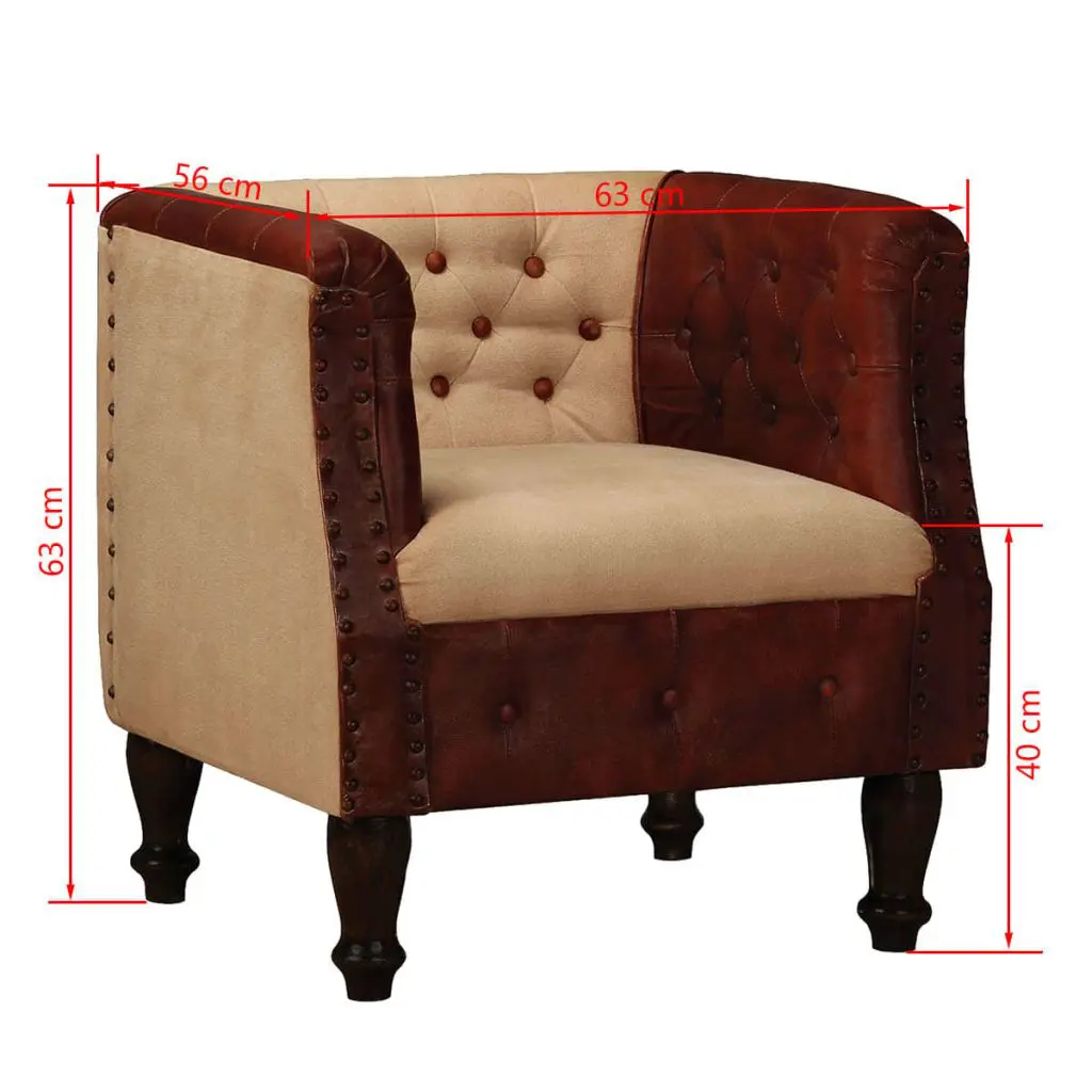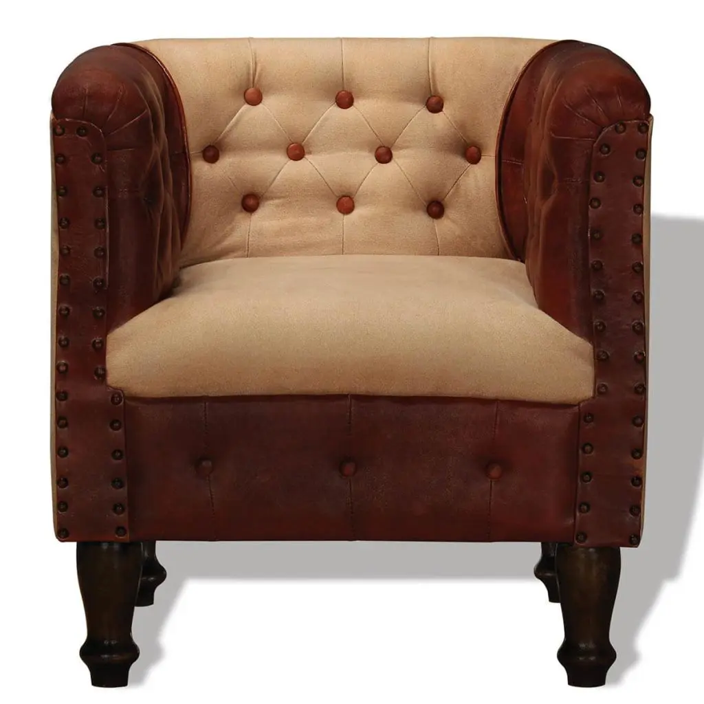 What can be better than relaxing in a comfortable armchair at the end of a busy day? Our real leather lounge chair will be the first thing you want to head for after a long day. Merging soft, durable real goat leather with comfy cotton fabric, this tub chair exudes a touch of vintage charm. The legs are made of solid sheesham wood and add to its retro style, and the upholstery is finished with rivets for an industrial look and feel. Thanks to the curved armrests and thickly padded seat and backrest, the leather armchair is the perfect place for you to sit comfortably and fully relax while watching TV or listening to music. This expertly crafted, handmade lounge chair has a classic design and will be a real eye-catcher in your living room, bedroom or guest room.