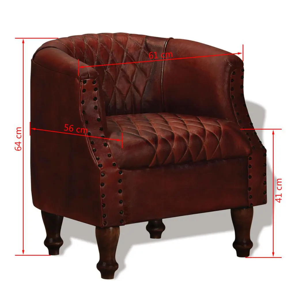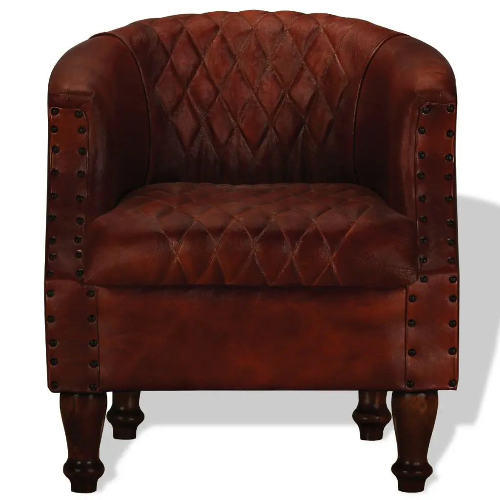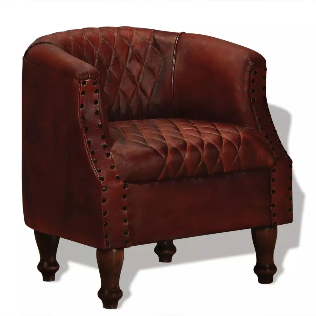 What can be better than relaxing in a comfortable armchair at the end of a busy day? Our real leather lounge chair will be the first thing you want to head for after a long day. The tub chair is upholstered in real goat leather, which is soft, durable, and exudes a vintage charm. The legs are made of solid sheesham wood and add to its retro style, and the upholstery is finished with rivets for an industrial look and feel. Thanks to the curved armrests and thickly padded seat and backrest, the leather armchair is the perfect place for you to sit comfortably and fully relax while watching TV or listening to music. This expertly crafted, handmade lounge chair will be a real eye-catcher in your living room, bedroom or guest room.