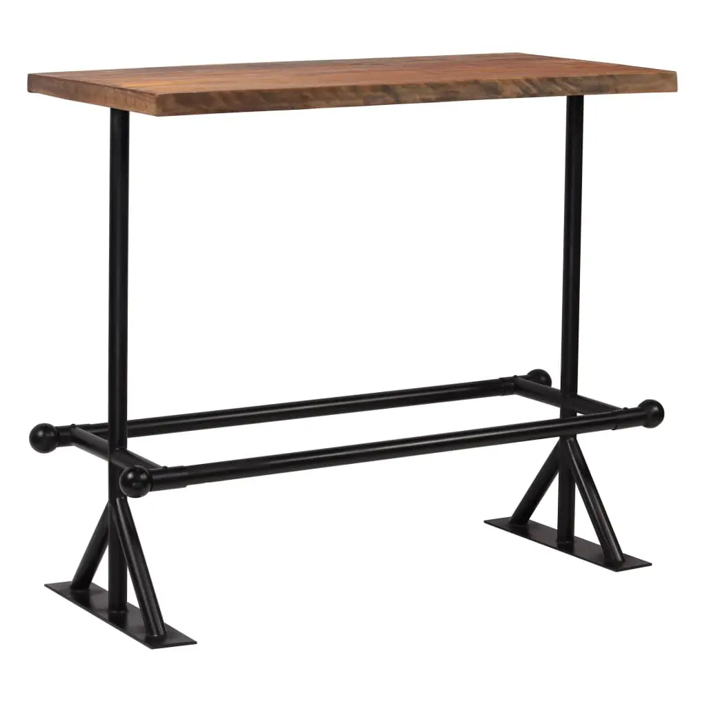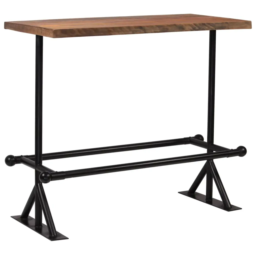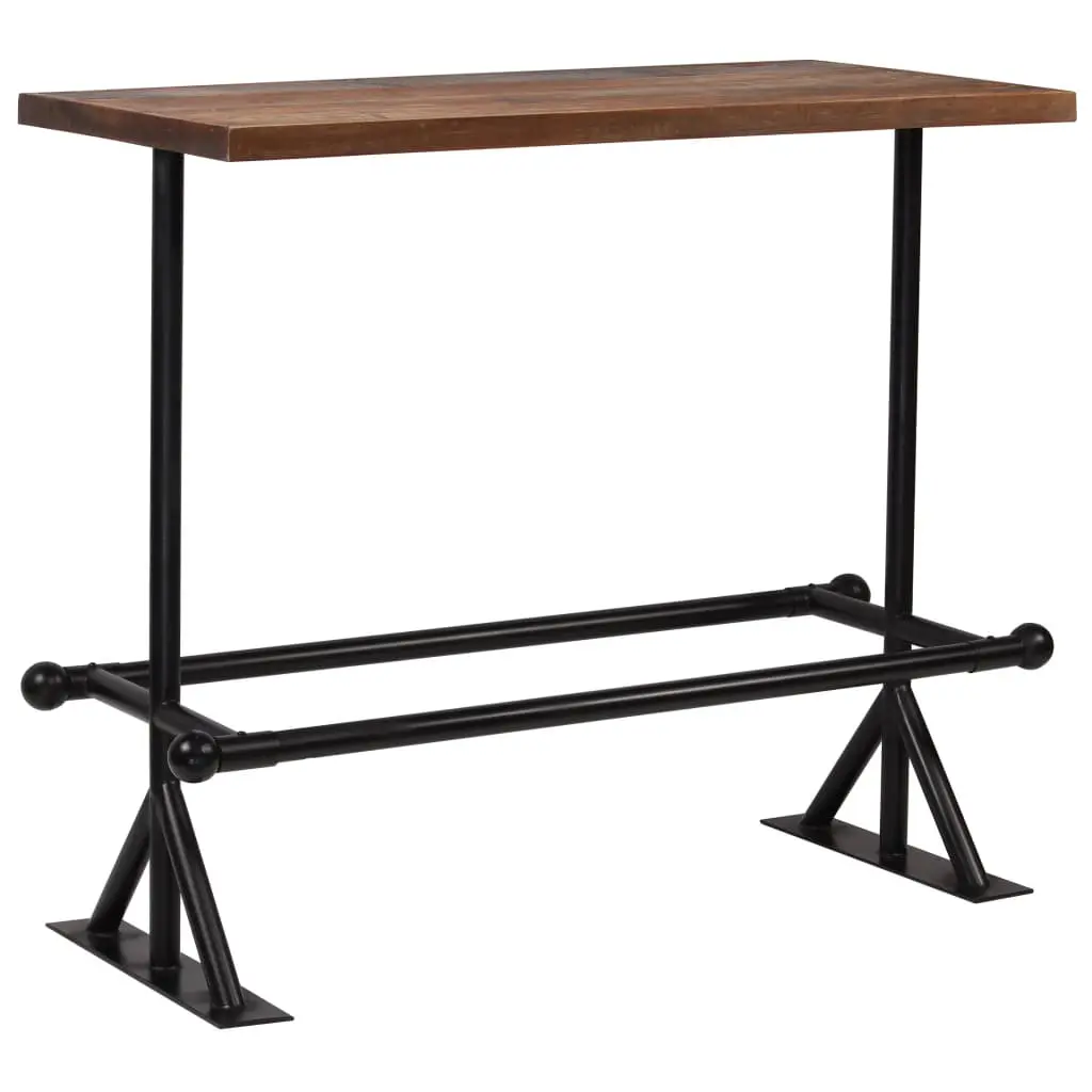 This antique-style wooden bar table oozes an industrial charm and will make a timeless addition to your home. The bar table is made of solid reclaimed wood that has been sourced from joists, floors and support beams from old buildings being demolished, and can consist of different types of wood like sheesham (rosewood), pine, teak, beech, oak, cedar, mango wood, acacia, etc. This means the reclaimed wood retains the characteristics of these different types of wood. Reclaimed wood is already aged, weathered and dried, so it doesn’t shrink or bend. The beautiful wood grains make every piece of furniture unique and slightly different from the next. Signs of wear and visible grain structure also give each dining table its own history and a unique look. Every step of the process is carried out with the greatest care, be it polishing, painting or lacquering. The steel legs add the table’s sturdiness and stability as well as its industrial style. The footrests allow you to sit comfortably on a chair or stool. Assembly is easy. Important note: Colours vary from piece to piece, making each of our standing tables unique; the delivery is random.