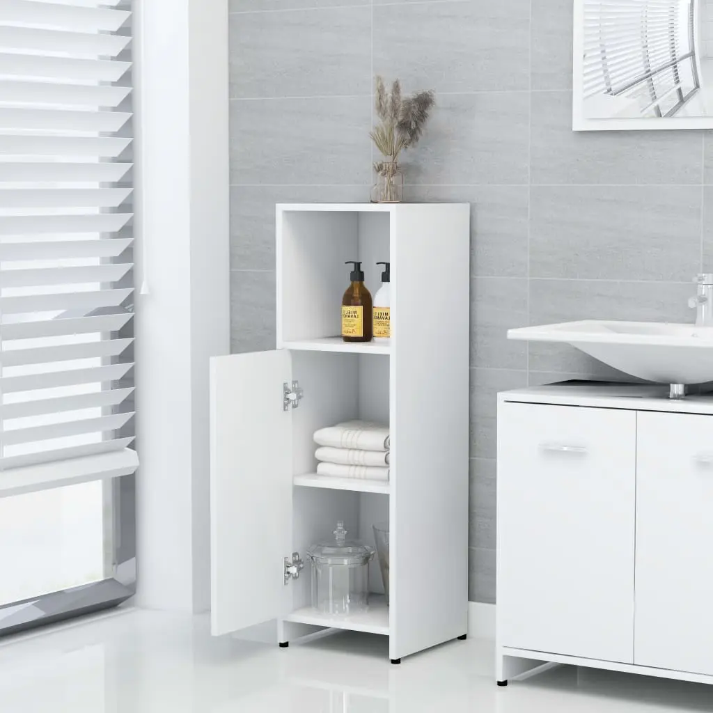With this bathroom cabinet, you can create additional storage space for your bathroom with a striking, tidy appearance. The clean lines and sleek design blend into your bathroom perfectly. This chic cabinet is made of board, making it sturdy and stable. The laundry room rack has 3 compartments and 1 door, offering various storage options and extra space to store items in your bathroom. There is a handle on door for better opening and closing. The cupboard is easy to clean with a damp cloth.