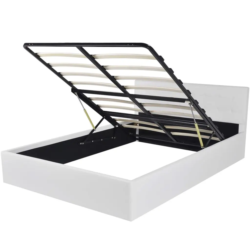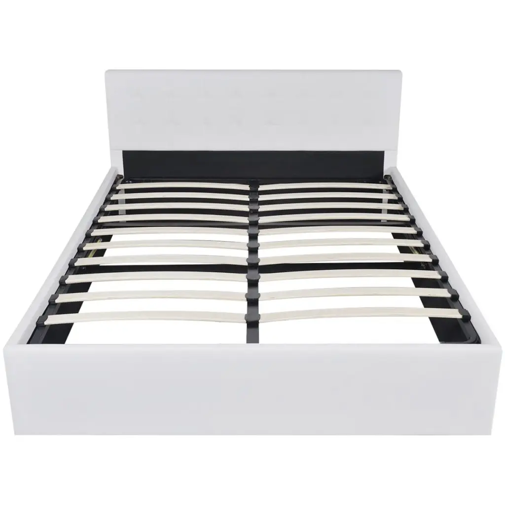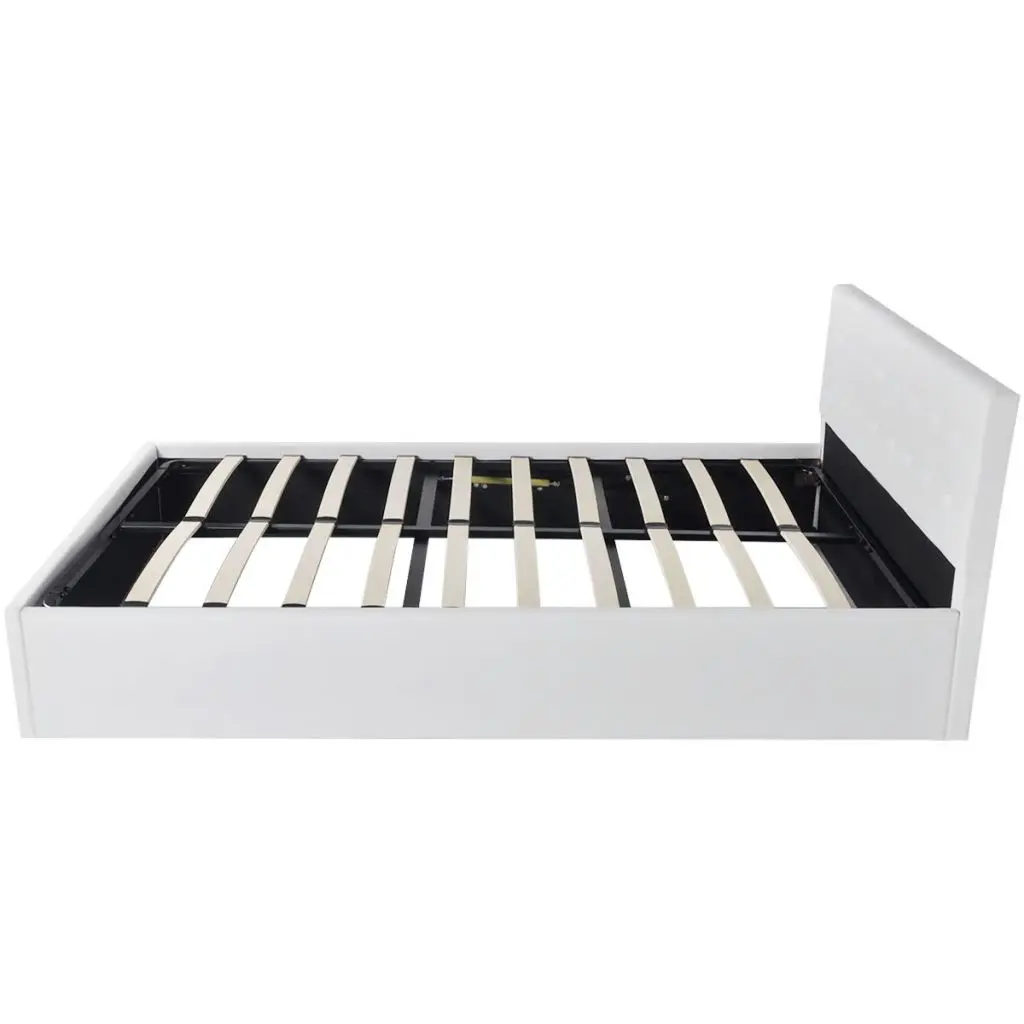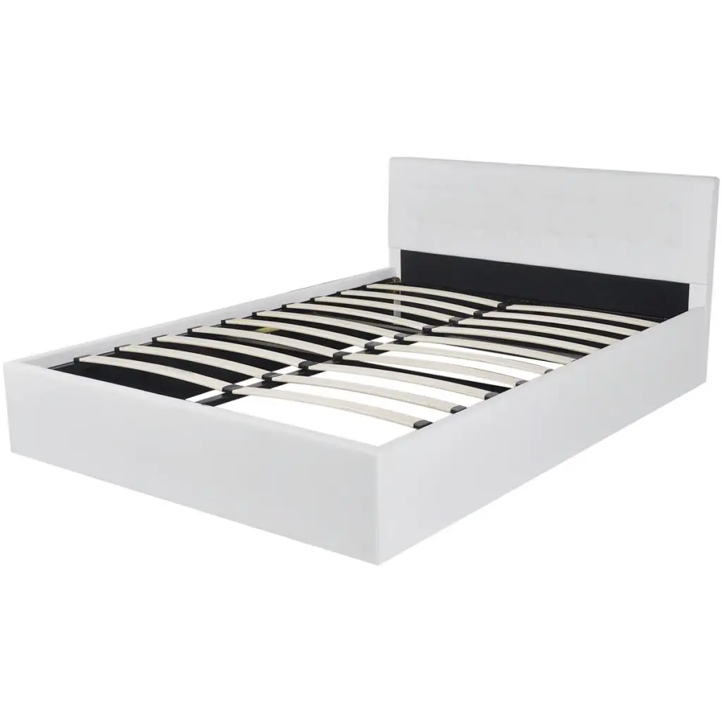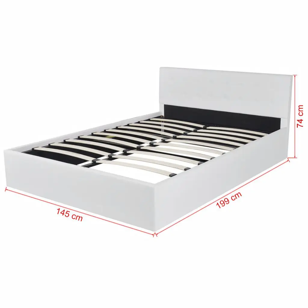 This solidly constructed artificial leather bed will make your room special and distinctive, for it has a simple yet stylish design, and a solid construction, which is crafted from strong and robust MDF. This bed frame turns the unused space under the mattress into the storage space, with ample room for storing clothings, sheets, blankets, etc. The hydraulic gas-lift mechanism makes lifting the mattress a breeze. The slat frame will remain upright once lifted to give you both hands free to remove or store items underneath. The sturdy plywood slats offer the needed support but are also highly comfortable. Upholstered with glossy artificial leather, this bed looks inviting and is easy to maintain. Assembly is really easy. This bed is suitable for a mattress of 187 x 137 cm. Please note delivery includes a bed frame only, a mattress is not included. Please note that this is a platform bed without any risers or bases.