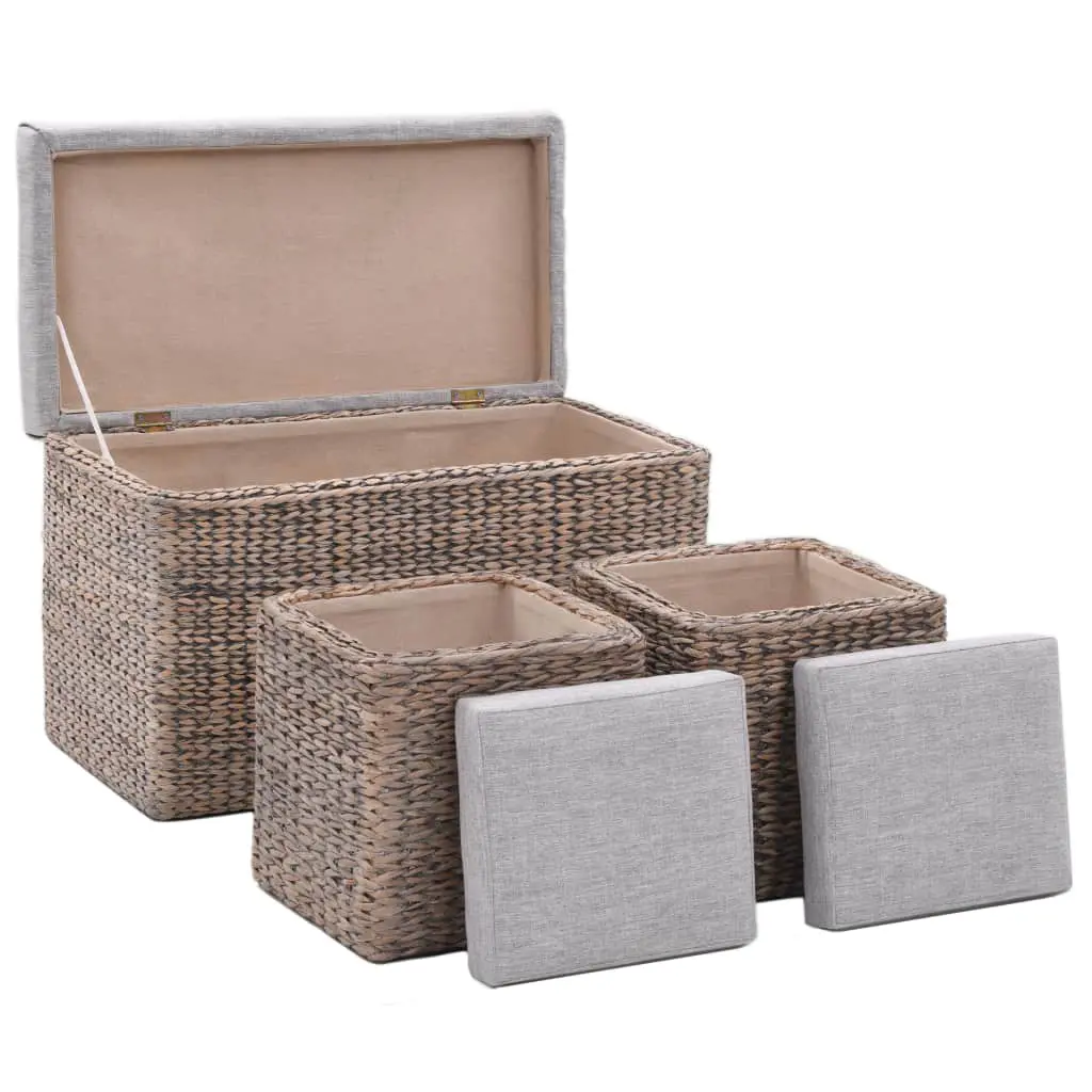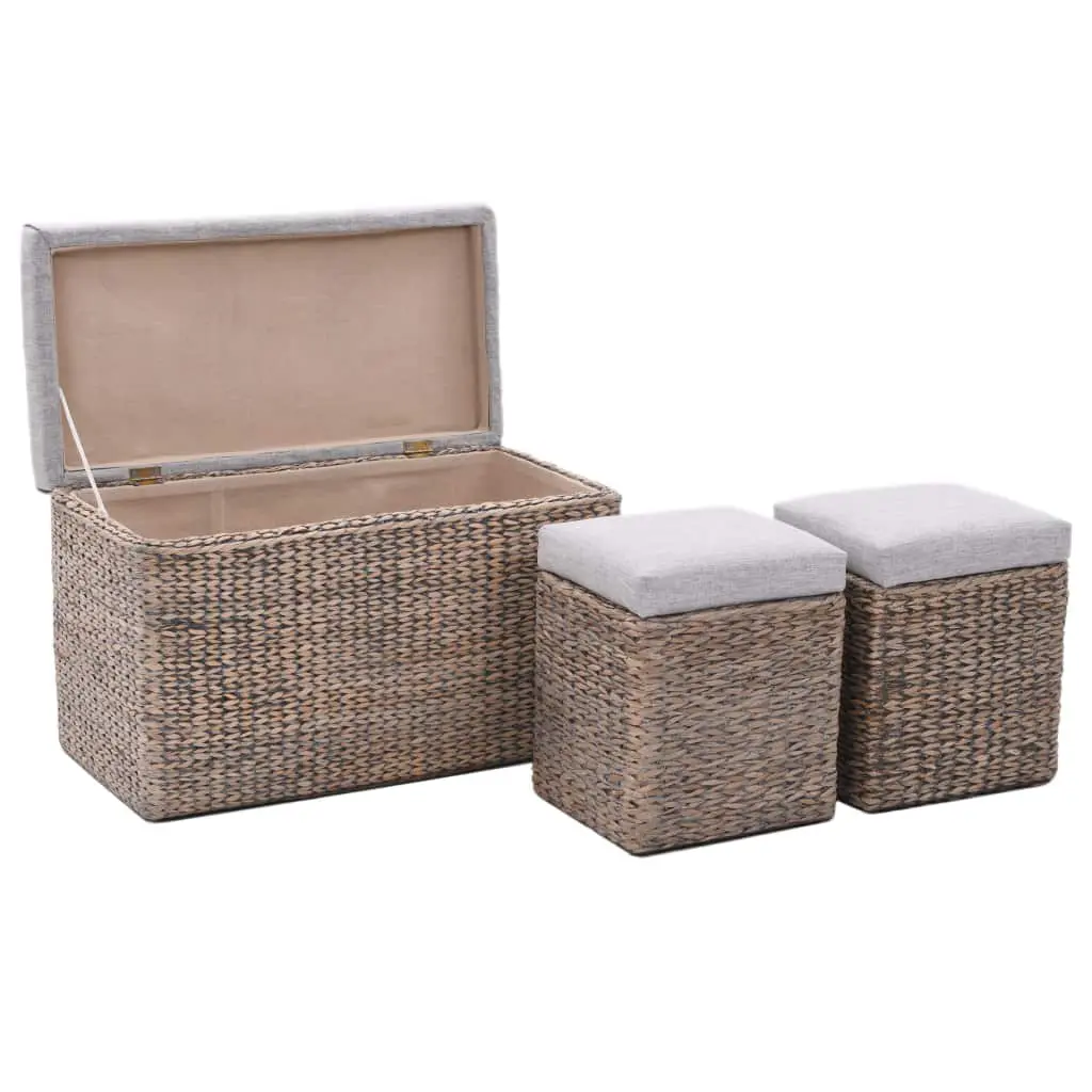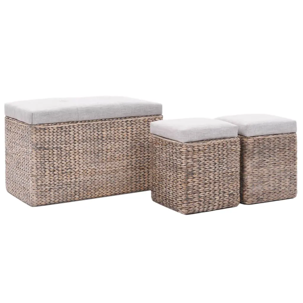 The bench set will make a timeless addition to your home decor. Made of seagrass, the bench and ottomans will add a rustic and natural charm to your room. The set provides ample storage space for keeping various items within reach and neatly organised. The cushions add to the set’s seating comfort. The set has been assembled; no assembly is required. Delivery includes 1 bench and 2 ottomans.