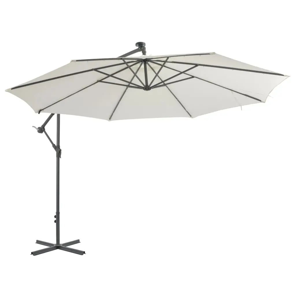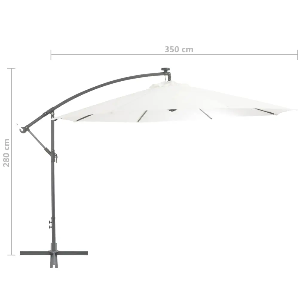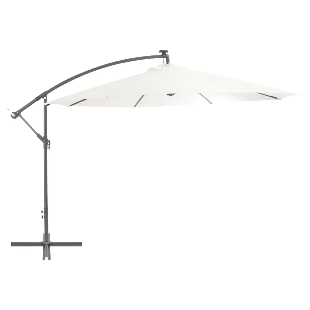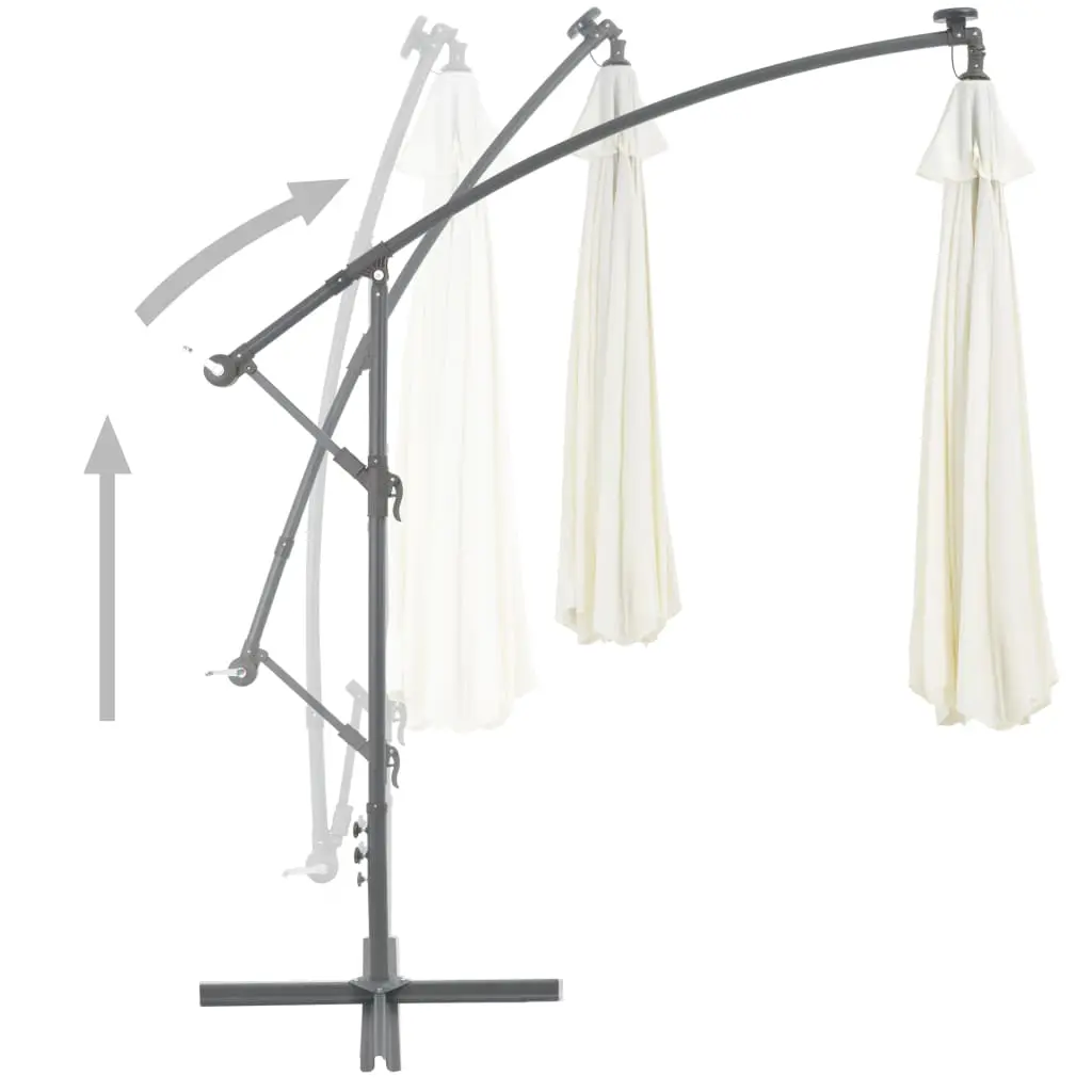 This elegant hanging parasol with LED lights is perfect to create some shade and protect you from the sun’s harmful UV rays. Made of UV protective and anti-fade polyester, the parasol cover provides you with optimum protection against the sun and is easy to clean. It features 24 solar-powered LEDs to automatically illuminate your outdoor living space and create a cosy and romantic ambience when the sun goes down. It also comes with a sturdy cross base to add stability. The exclusive design of this parasol allows you to tilt the parasol to block the sun as it heads down towards the horizon. The strong metal pole, along with the 8 durable ribs, makes the parasol very stable and durable. Our garden umbrella can be easily opened and closed thanks to the crank mechanism. The item is easy to assemble. Please note that we recommend treating the umbrella fabric with a waterproofing spray if it is subjected to heavy rainfall.