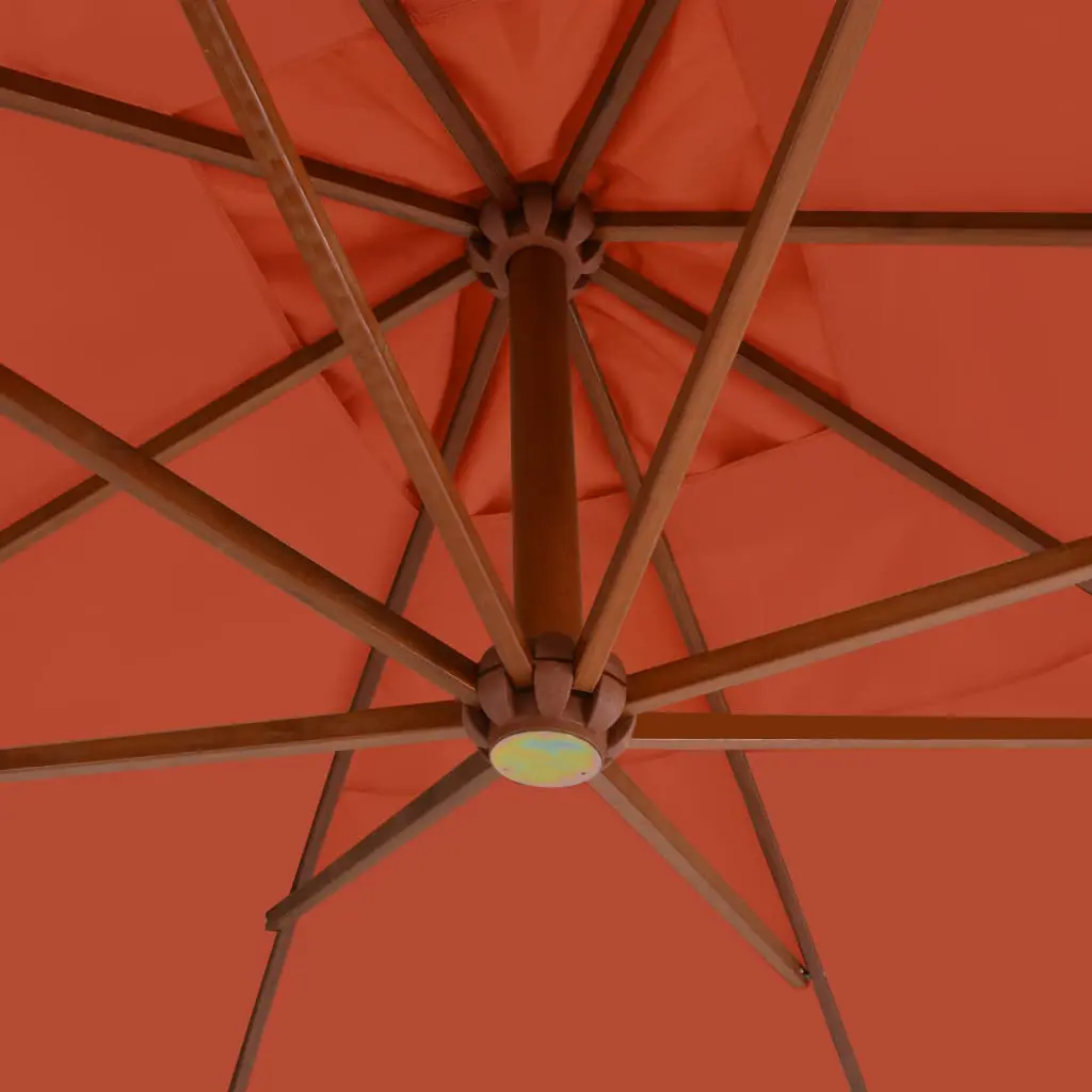 This wooden elegant hanging parasol is perfect to create some shade and protect you from the sun’s harmful UV rays. Made of UV protective and anti-fade polyester, the parasol cover provides you with optimum protection against the sun and is easy to clean. It features a sturdy cross base to add stability. The exclusive design of this parasol allows you to tilt the parasol to block the sun as it heads down towards the horizon. The strong wooden pole, along with the 8 durable ribs, makes the parasol very stable and durable. Our garden umbrella can be easily opened and closed thanks to the crank mechanism. The item is easy to assemble. Please note that we recommend treating the umbrella fabric with a waterproofing spray if it is subjected to heavy rainfall.