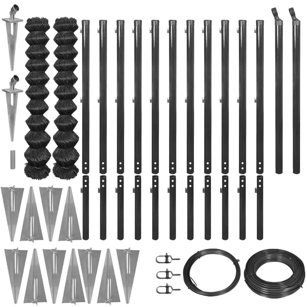 This high-quality galvanised chain-link fence set has a total length of 25 metres. It will form a sturdy, safe and maintenance-free perimeter barrier for your garden, home, business property or animal enclosure. The mesh fence with 2.6 mm-thick wires is UV-resistant and weatherproof. As it has been galvanised and given a PVC coating, you won’t have to worry about this fencing rusting or weakening. Delivery includes 2 chain-link fence rolls, 11 fence posts, 11 spike anchors for fence posts, 2 strive posts, 2 spike anchors for strive posts, 11 connecting posts, 1 span wire, 1 binding wire and 3 wire tensioners and 1 metal hammering tube.