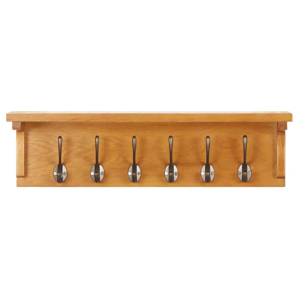 Our coat rack is meant to make a decorative as well as practical addition to your room. This coat hanger, made of solid oak wood, has a sturdy structure and is extremely durable. With 6 hooks, the rack provides ample space for hanging your coats, hats, bags, hats, etc. It suits any decor and turns an empty wall or dull wardrobe into a feature! Delivery includes the coat rack and hardware for assembly onto the wall.