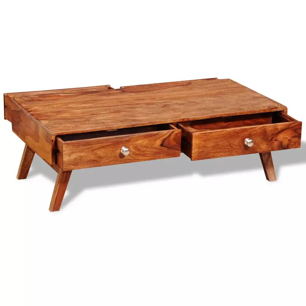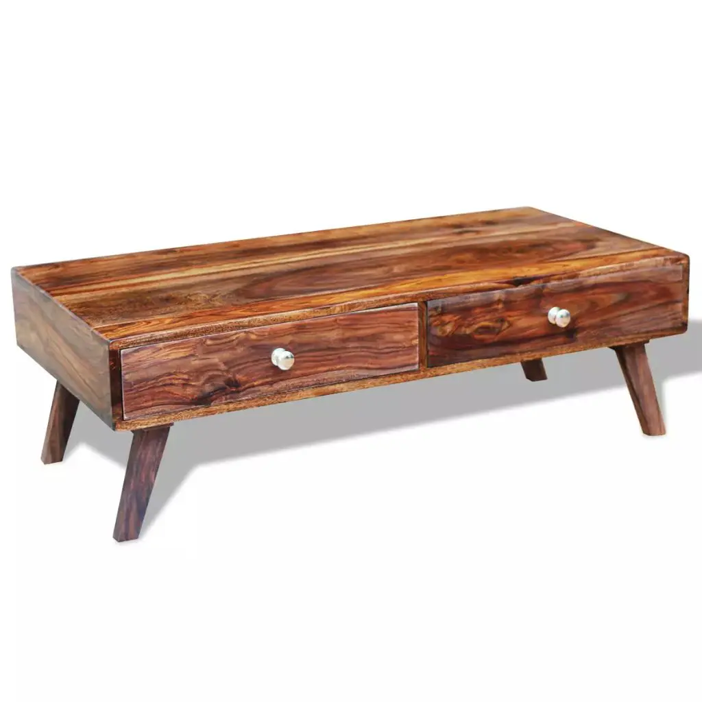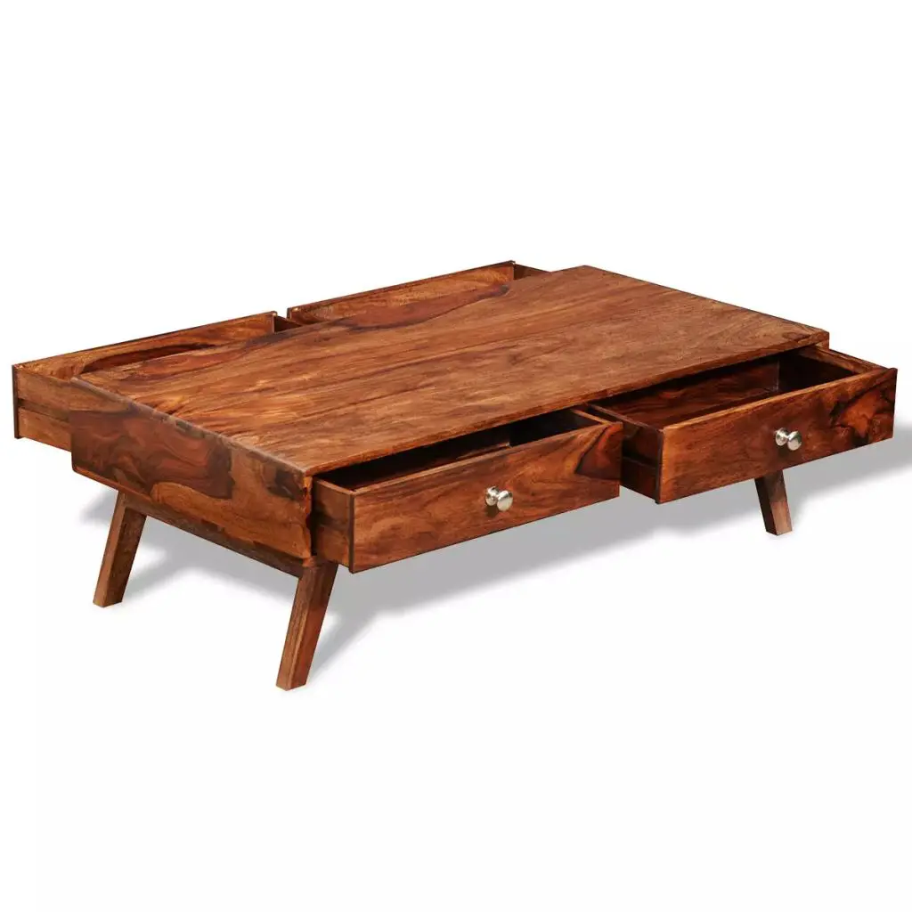 This vintage sheesham wood coffee table is both stylish and practical. The elegant design will make this coffee table a focal point of any room. This coffee table has a sturdy top, on which you can place decorative items like fruit baskets or vases. Its 4 large drawers offer you extra storage space for your ornaments, cosmetics and other private belongings. This sheesham coffee table is made of solid wood. Sheesham is a tropical hardwood that is famous for its rich grains and also known as rosewood or palisander. It’s fully handmade, and the beautiful wood grains make every piece of furniture unique and slightly different from each other. The strong wooden legs contribute to the sturdy construction. Important note: Colours vary from piece to piece, making each piece unique; the delivery is random.