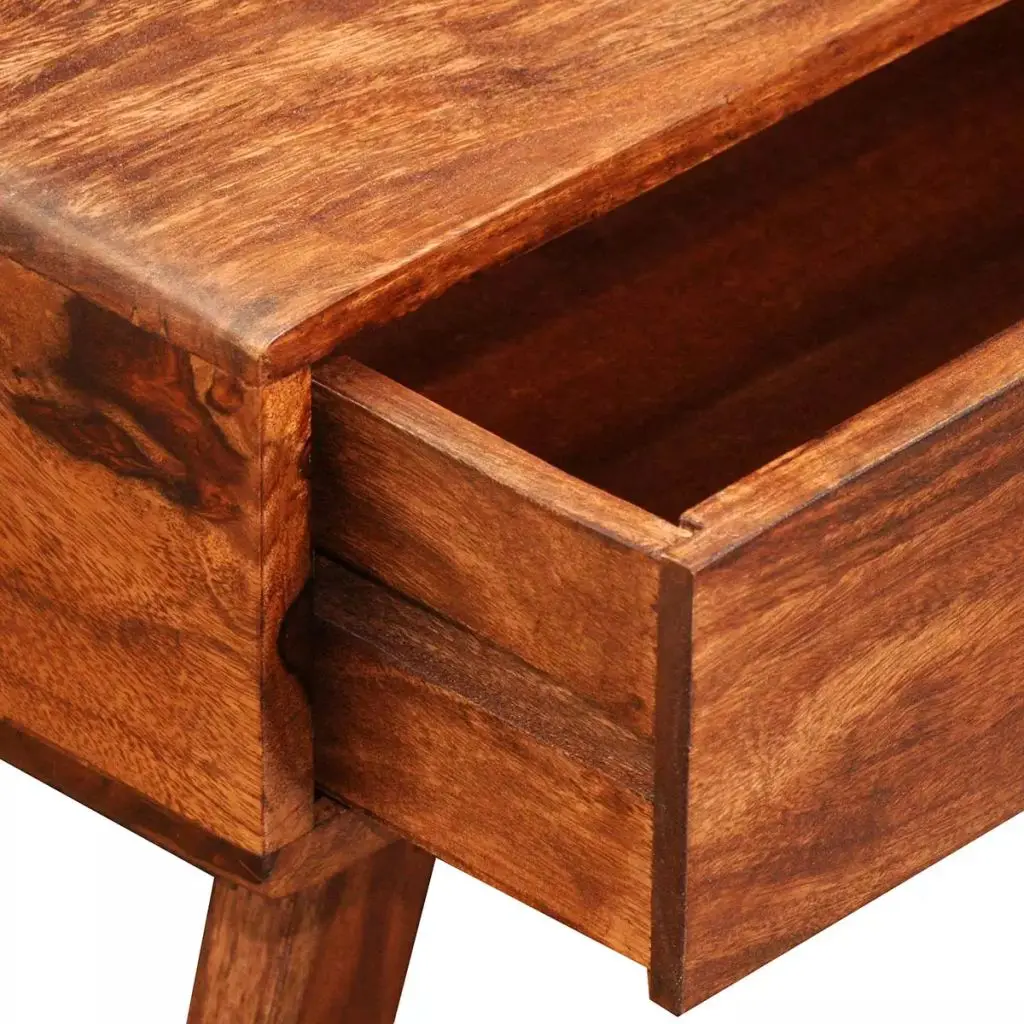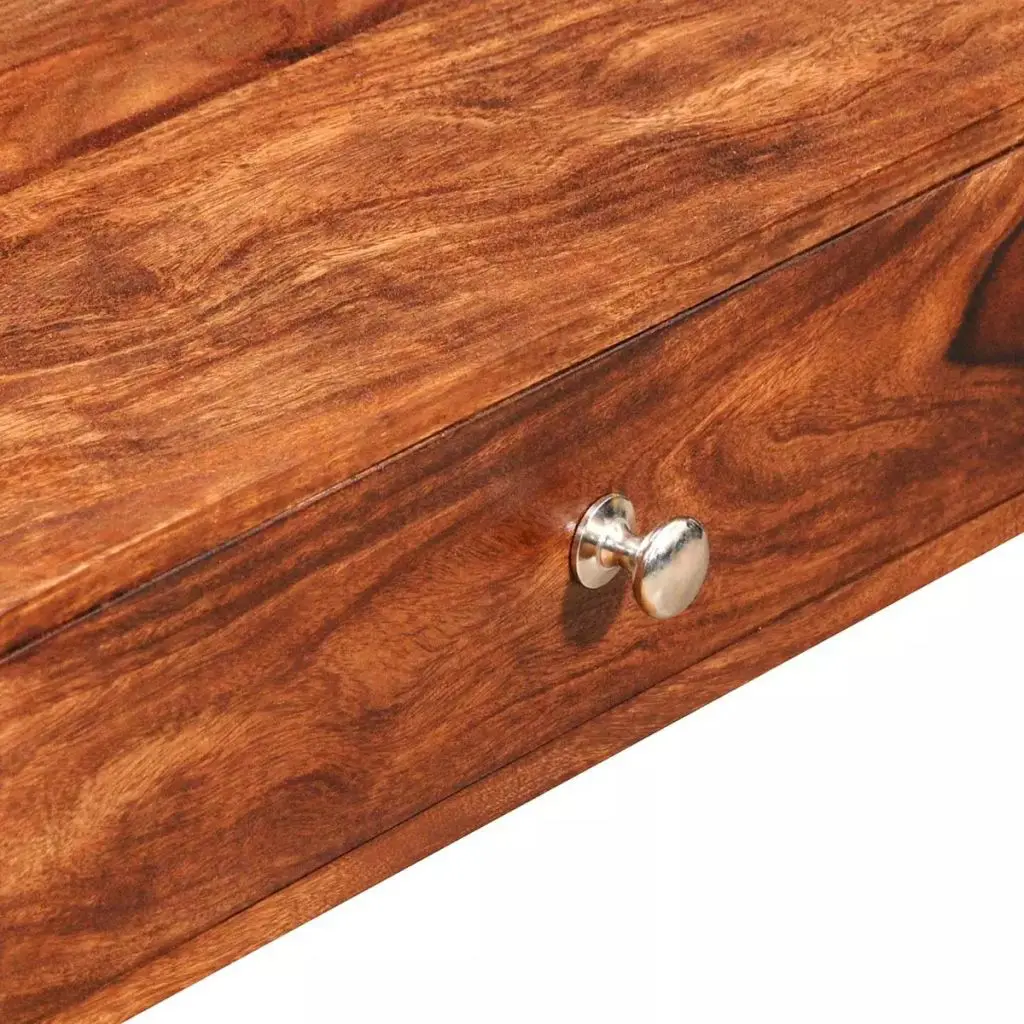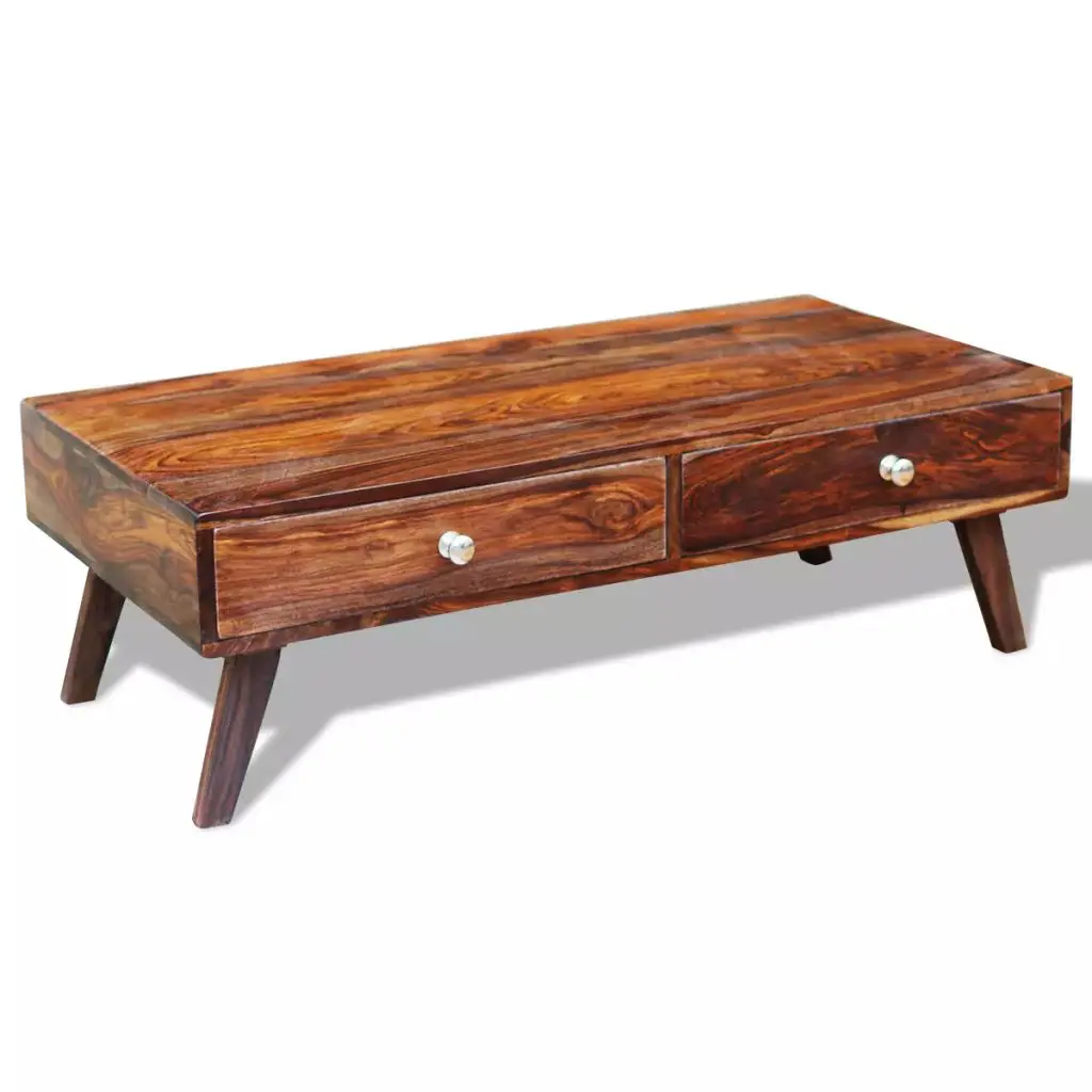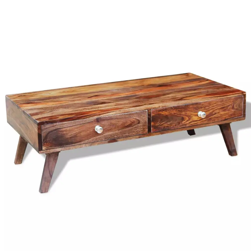 This vintage sheesham wood coffee table is both stylish and practical. The elegant design will make this coffee table a focal point of any room. This coffee table has a sturdy top, on which you can place decorative items like fruit baskets or vases. Its 4 large drawers offer you extra storage space for your ornaments, cosmetics and other private belongings. This sheesham coffee table is made of solid wood. Sheesham is a tropical hardwood that is famous for its rich grains and also known as rosewood or palisander. It’s fully handmade, and the beautiful wood grains make every piece of furniture unique and slightly different from each other. The strong wooden legs contribute to the sturdy construction. Important note: Colours vary from piece to piece, making each piece unique; the delivery is random.