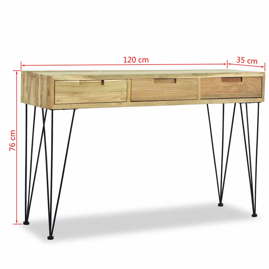 This colonial-style console table, made of recycled solid teak, will add a touch of rustic charm to your interior. It can also be used as a side table, desk or sideboard. The table has a sturdy hardwood top, on which you can place decorative items like fruit baskets or vases. The 3 drawers provide ample space for keeping all kinds of smaller items organised and within reach. This sturdy side table is supported by strong wrought iron legs. Assembly is really easy. Important note: The colours and grains vary from piece to piece, making each of our console tables unique; the delivery is random.