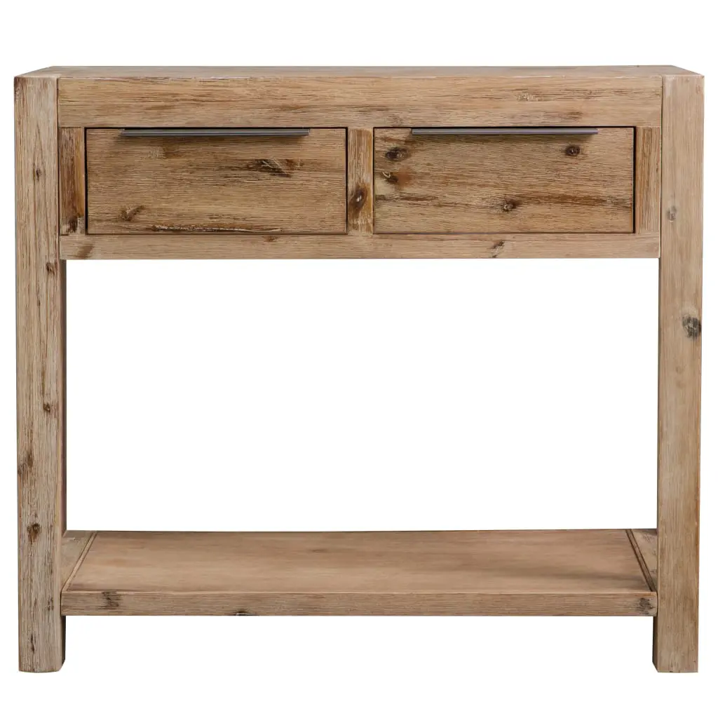 This solid acacia wood console table with a brushed finish will add a touch of rustic charm to your interior. The wooden console table is crafted from solid acacia wood, which makes it very durable and hard-wearing. The brushed finish gives the table an authentic, distressed and retro look and your home more of a traditional appearance. The console table has a sturdy top, on which you can place decorative items like fruit baskets or vases. The shelf and 2 drawers provide ample space for keeping all kinds of smaller items organised and within reach. This product needs assembly.