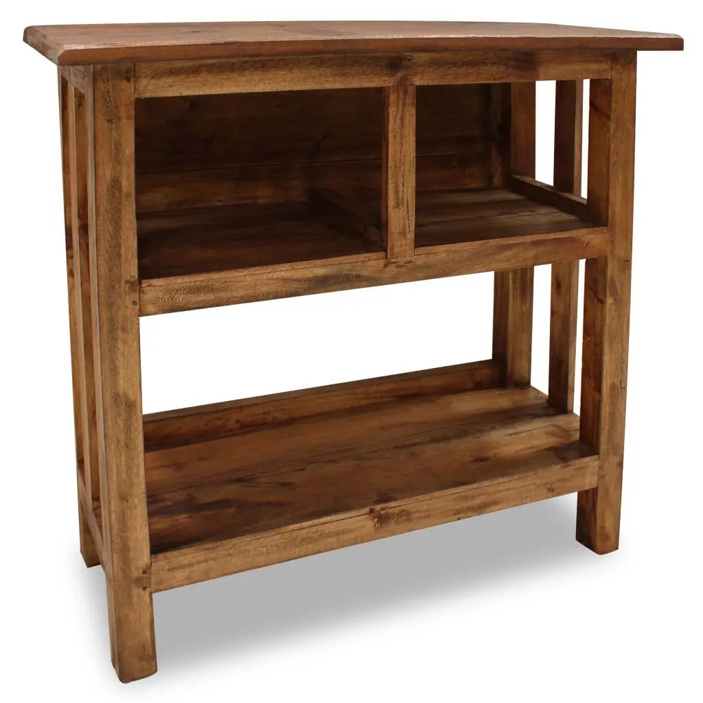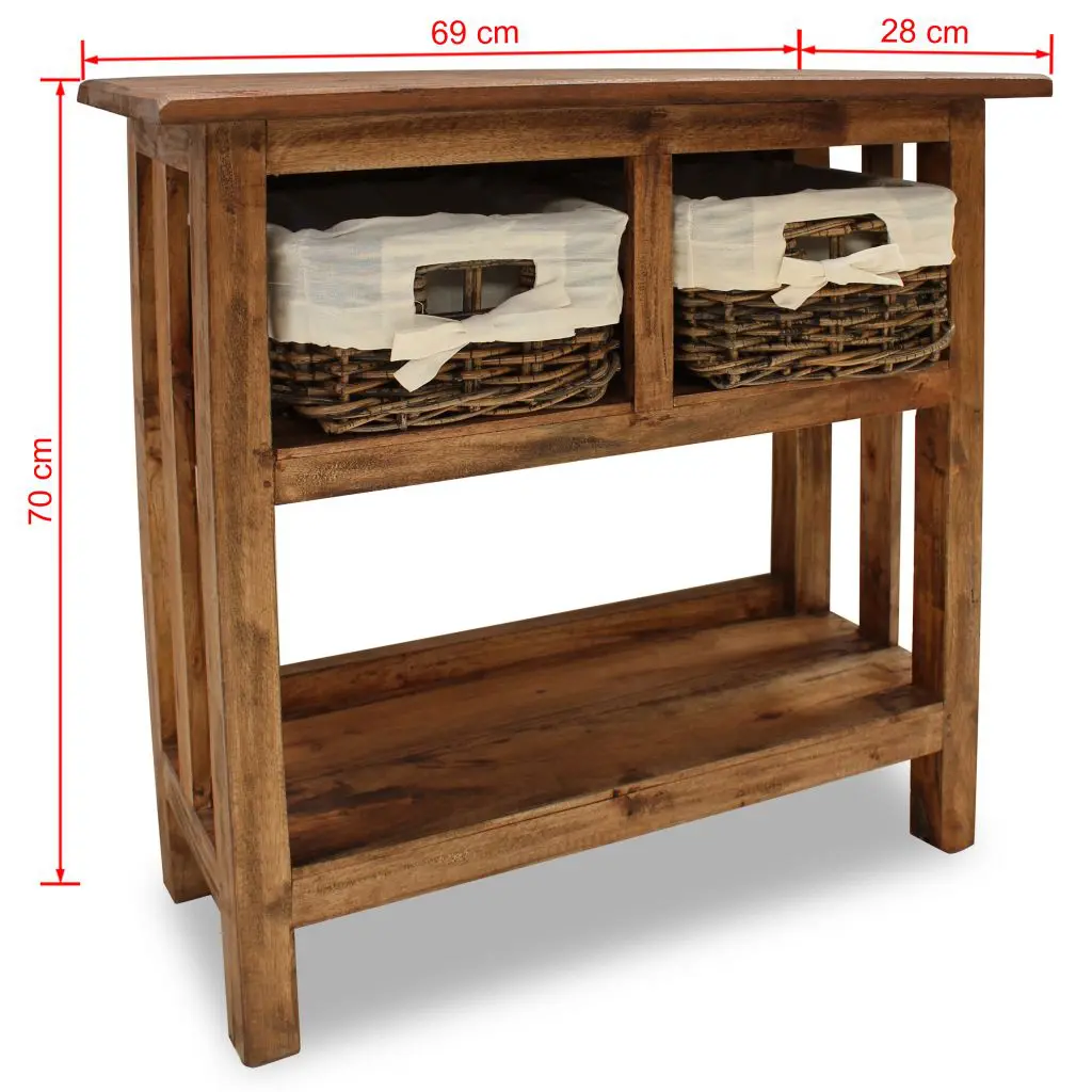 This wooden console table will be a perfect choice if you are looking to add a touch of rustic charm to your home decor. The table has 2 removable rattan baskets and 1 shelf, providing ample storage space. The removable baskets are not only practical but also add a decorative touch. This console table is made of solid reclaimed wood, which has the characteristics of different woods like mahogany, teak, mango wood, acacia, etc. Every piece of the furniture is unique and slightly different from the next. Signs of wear give each piece a unique look and add to its spectacular vintage style. As it is made of reclaimed wood, the product may show imperfections which reflect its authentic value and rich history. The wood comes from naturally fallen trees, boats, wooden houses, etc. Important note: The colours vary from piece to piece, making each of our tables unique; the delivery is random.