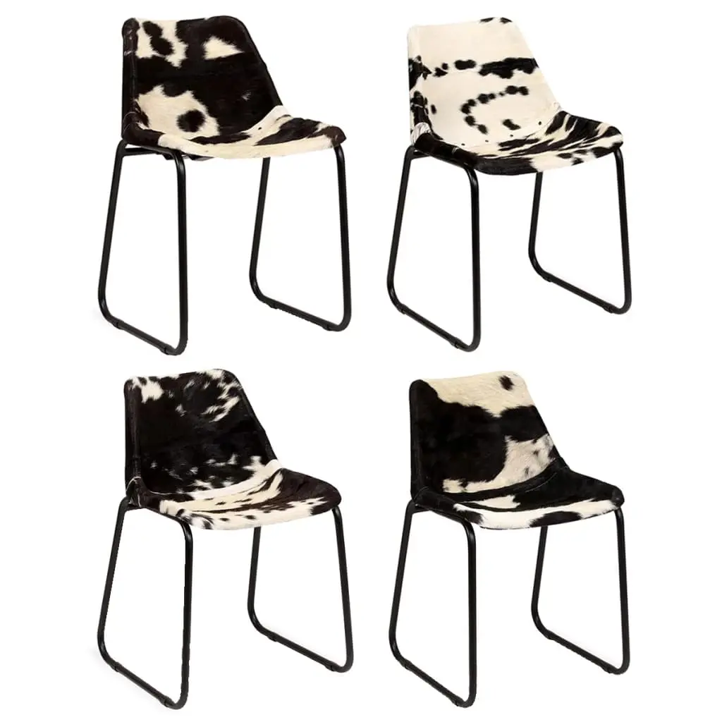 These dining chairs will make a timeless addition to your home with their rugged retro style. They can also be used as stylish office chairs. The chairs are made of genuine goat leather with a cowhide look and supported by sturdy and durable steel legs that add to their industrial look. The comfortable seats have an ergonomic design. Delivery includes 4 real leather dining chairs. Assembly is easy. Important note: The leather patterns may vary from piece to piece, making each of our dining chairs unique. The delivery is random.