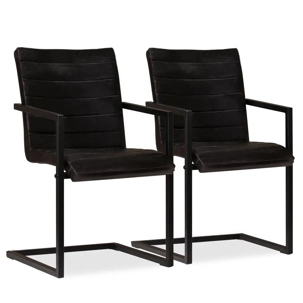 This dining chair set with its retro design will suit any kitchen or dining room. Thanks to the thickly padded seat and backrest, these real leather chairs are very comfortable and also easy to clean. The sturdy steel frame makes them strong and durable. Assembly is easy. Delivery includes 2 real leather dining chairs.