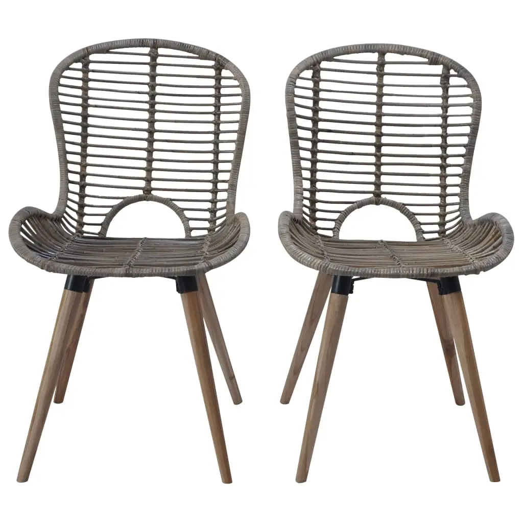 Our unique natural rattan chairs are a perfect combination of style and functionality. They will become the eye-catcher in your kitchen or living room! Thanks to the natural rattan seating and backrest areas, the chairs are water resistant and easy to clean. The wooden legs ensure this set of furniture stable and durable and give their vintage style. These chairs will suit any decor and are easy to assemble. Delivery includes 2 dining chairs.