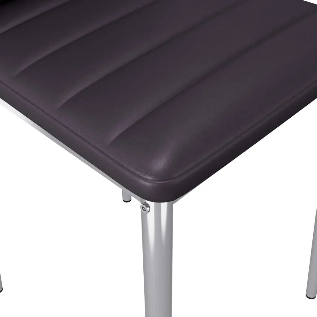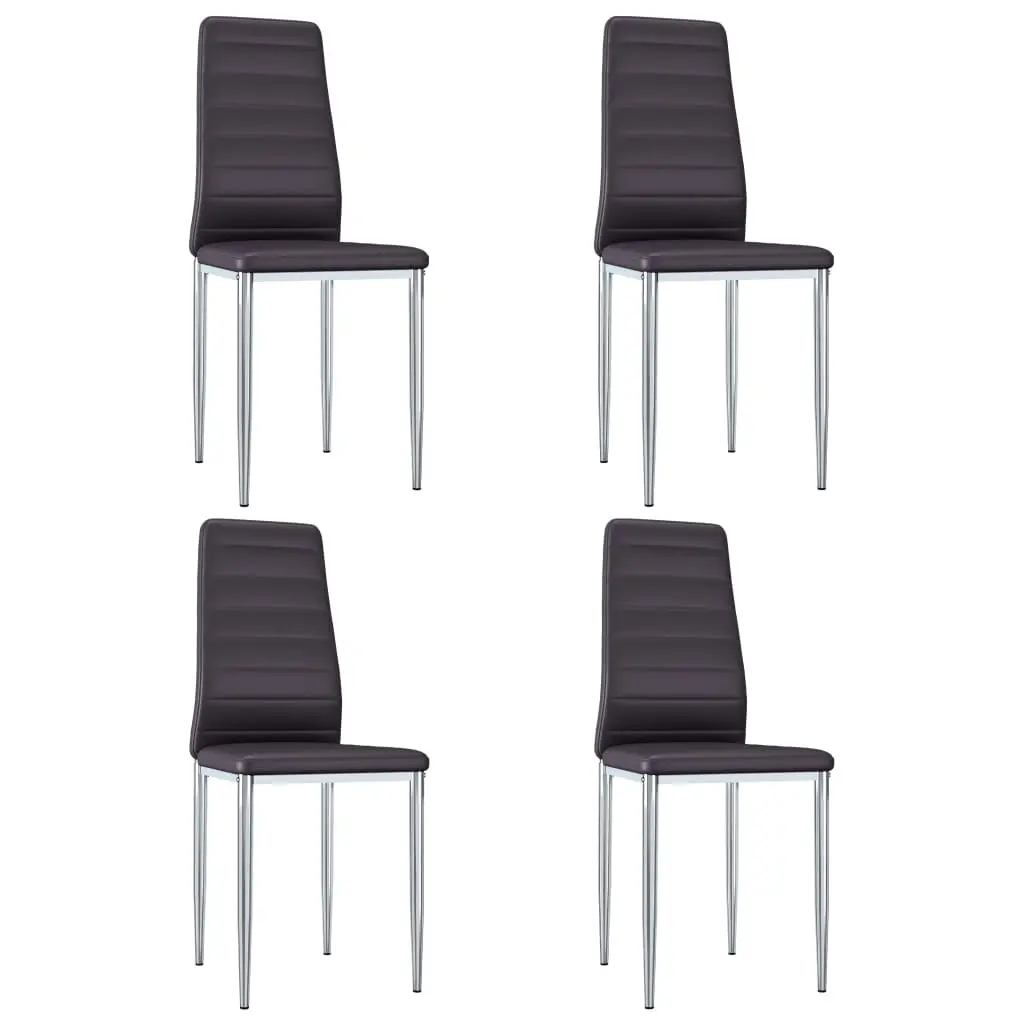This set of 4 dining chairs, with a clean, contemporary design, will perfectly fit in any interior. The chairs have a sturdy metal chrome frame and are upholstered in a high-quality faux leather that is soft and durable. Thanks to the thickly-padded seats and backrests, as well as the ergonomic design, these dining chairs are highly comfortable. The chairs are easy to assemble. Delivery includes 4 dining chairs.