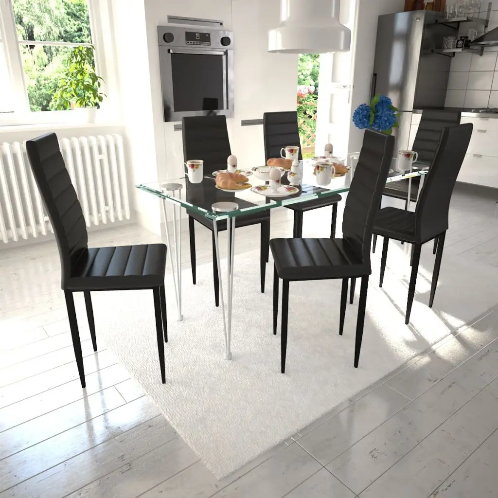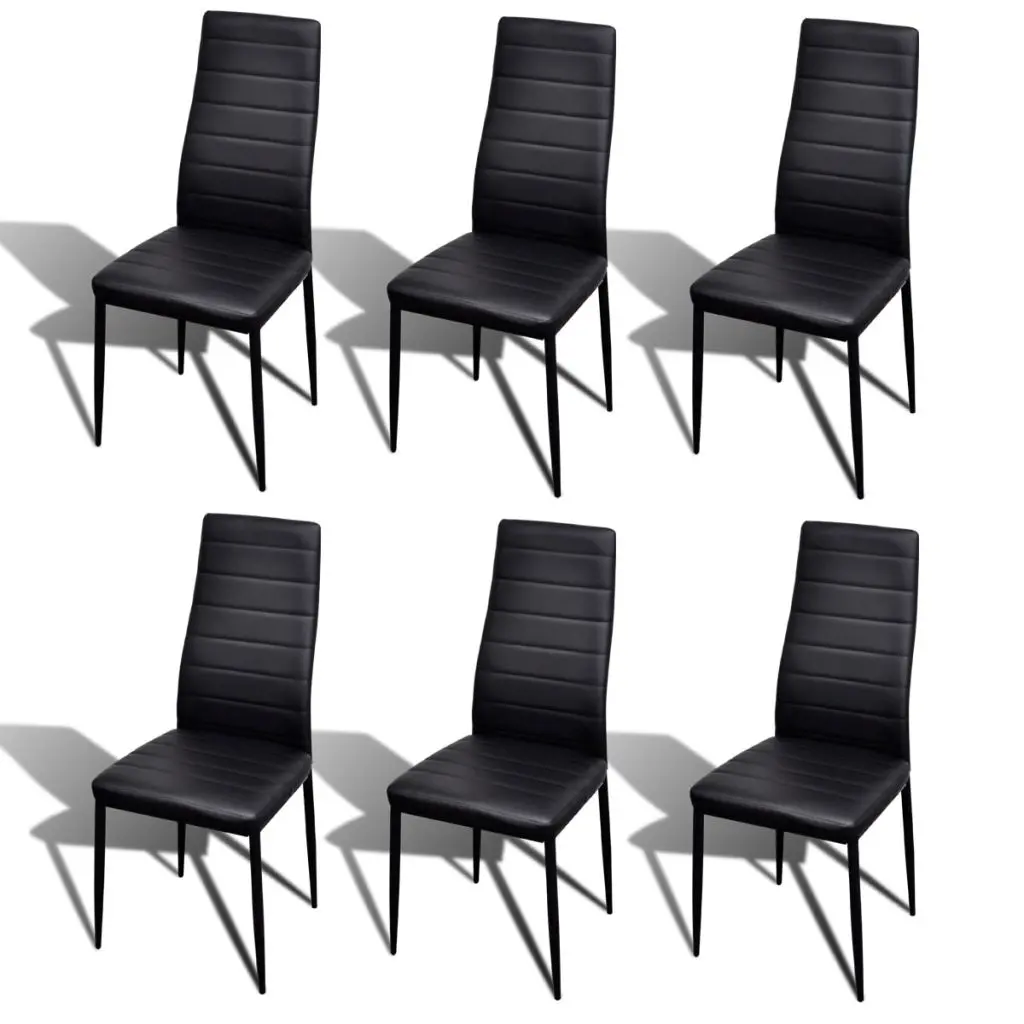 This dining chair set with its sleek, modern design, will suit any kitchen or dining room. Thanks to the wear-resistant and stain-proof artificial leather and its thickly padded seat, this chair is very comfortable to sit on. These attractive chairs are contemporary yet timeless. Assembly is easy. Delivery includes 6 x high-quality chair.
