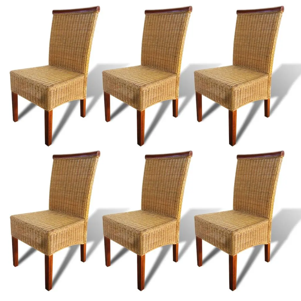 This genuine rattan dining chair set, with a tropical look and feel, features a solid wood decorative strip and will make a great addition to your decor. The hard wood frames and the genuine rattan make the chairs not only structurally solid, but also aesthetically pleasing. The genuine rattan covered seats are very comfortable. If you are looking for something to complement your kitchen or dining room decor, this attractive handwoven chair set will be a great choice. Delivery includes 6 chairs. Please note: The chairs are handwoven with genuine rattan, therefore may have some colour variations.