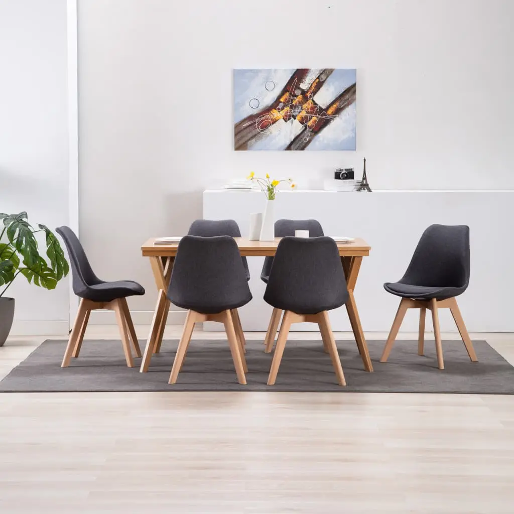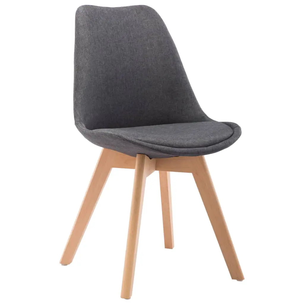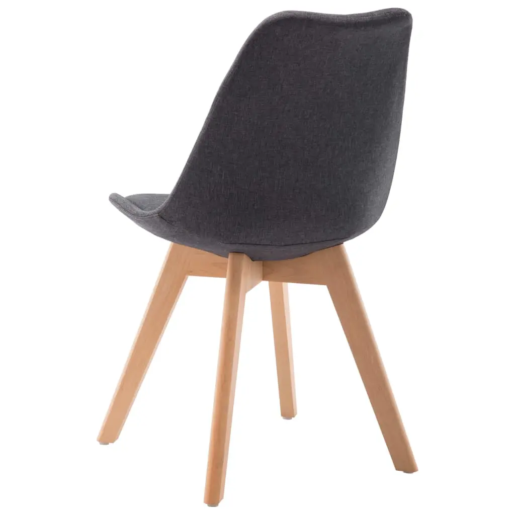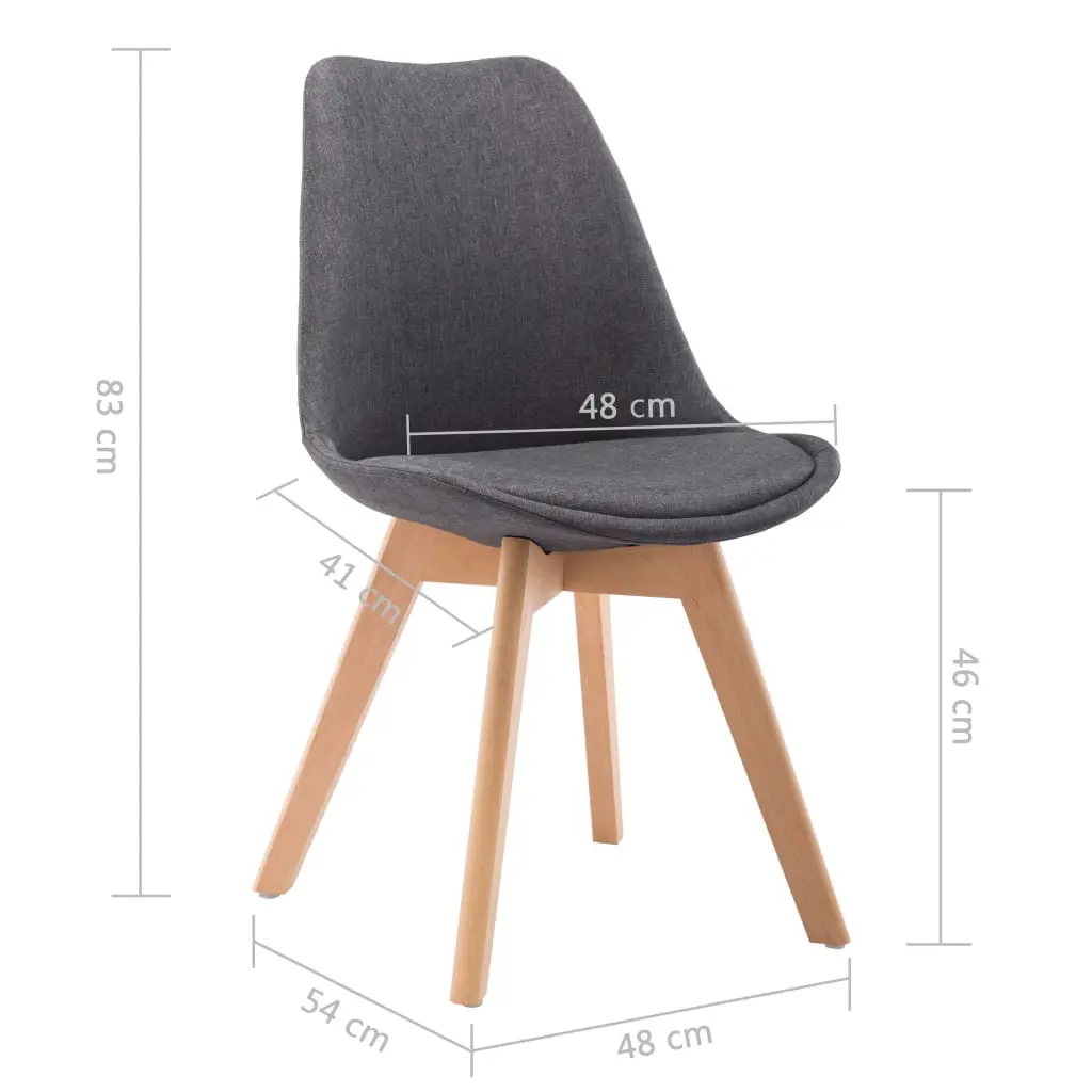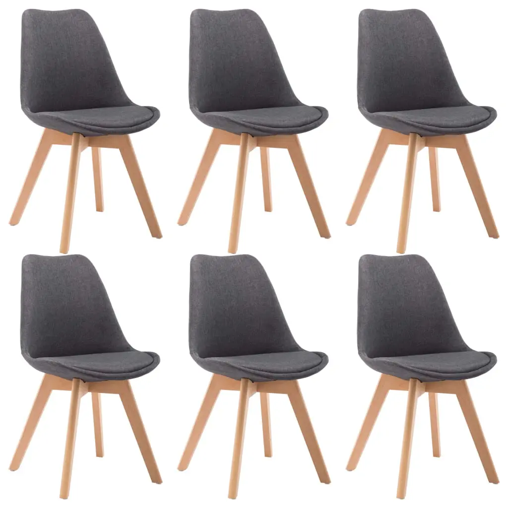 These fabric dining chairs have a timeless appearance thanks to their retro styling. They can also be used as stylish office chairs. The dining chairs have strong wooden legs. Upholstered in high-quality fabric, the seat is padded for added comfort. Add a touch of cool retro style to your living space with this set of dining chairs! Delivery includes 6 dining chairs. The chairs are easy to assemble.