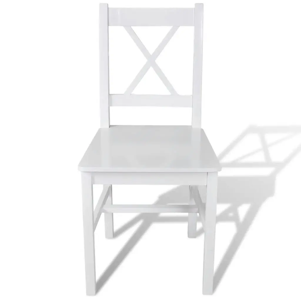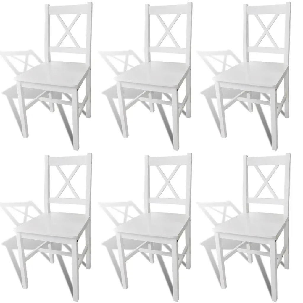 This wooden dining chair set, with a simple yet elegant design, consists of 6 pieces and will make a great addition to your dining room or kitchen.The chairs are made of solid pine wood, which makes them very stable and durable. The dining chairs are also easy to clean, thanks to their smooth paint finish. They’ve been ergonomically designed for added comfort.Delivery includes 6 dining chairs.