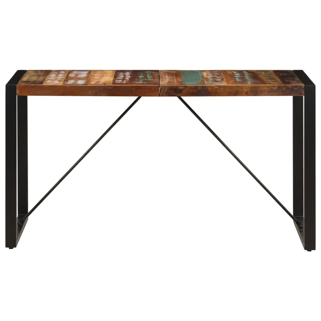 This retro wooden dining table oozes a rustic charm and will make an eye-catching addition to your interior. The antique dining table is made of solid reclaimed wood that has been sourced from joists, floors and support beams from old buildings being demolished, and can consist of different types of wood like sheesham (rosewood), pine, teak, beech, oak, cedar, mango wood, acacia, etc. This means the reclaimed wood retains the characteristics of these different types of wood. Reclaimed wood is already aged, weathered and dried, so it doesn’t shrink or bend. This table is fully handmade and the elegant wood grains make every piece of furniture extraordinary and slightly different from each other. Additionally, the strong powder-coated steel legs add to the table’s sturdiness. The dining room table is easy to assemble. Important note: The colours and wood grains vary from piece to piece, making each piece unique; the delivery is random.