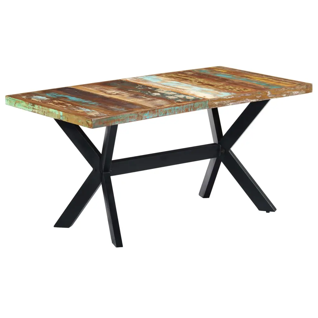 This wooden dining table exudes an industrial style which will make a distinctive addition to your kitchen or dining room. The dining table is made of solid reclaimed wood that has been sourced from joists, floors, as well as support beams from old demolished buildings, and it can consist of different types of wood like sheesham (rosewood), pine, teak, beech, oak, cedar, mango wood, acacia, etc. This means the reclaimed wood retains the characteristics of these different types of wood. Reclaimed wood is already aged, weathered and dried, accordingly, it doesn’t shrink or bend. The dining table is handmade and each step of the process is carried out with the greatest care, be it polishing, painting or lacquering. Additionally, the steel legs complete the industrial look, along with the steel cross frame that contributes to the sturdy construction. Important note: The colours may vary from piece to piece, making each of the dining tables unique; the delivery is random.