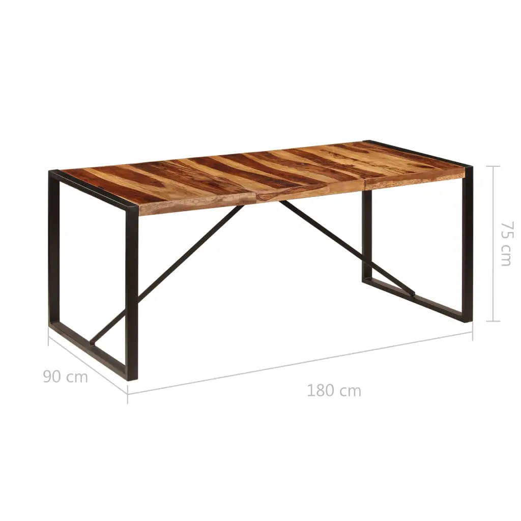 This striking wooden dining table in the industrial style will make a distinctive addition to your kitchen or dining room. This dinner table is made of solid Sheesham wood, which is also known as rosewood or Palisander, is a tropical hardwood that is famous for its natural grains and smooth texture. Additionally, it doesn’t warp or split, and has natural decay resistance. The exquisite craftsmanship adds to the table’s spectacular retro style. The powder-coated steel legs complete the industrial look. Every step of the process is carried out with the greatest care, be it polishing or lacquering. Assembly is easy. Important note: The solid Sheesham wood shows natural grains, making each of our dining tables unique and slightly different from the next; the delivery is random.