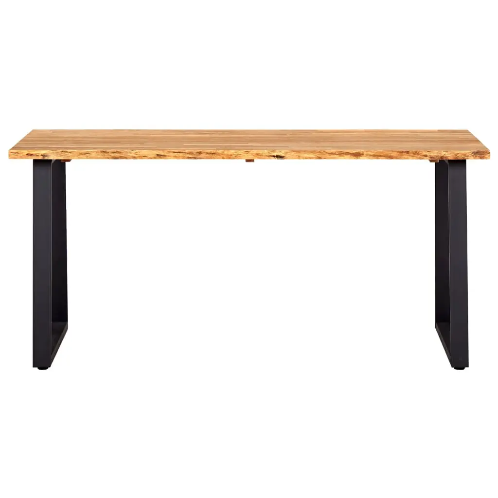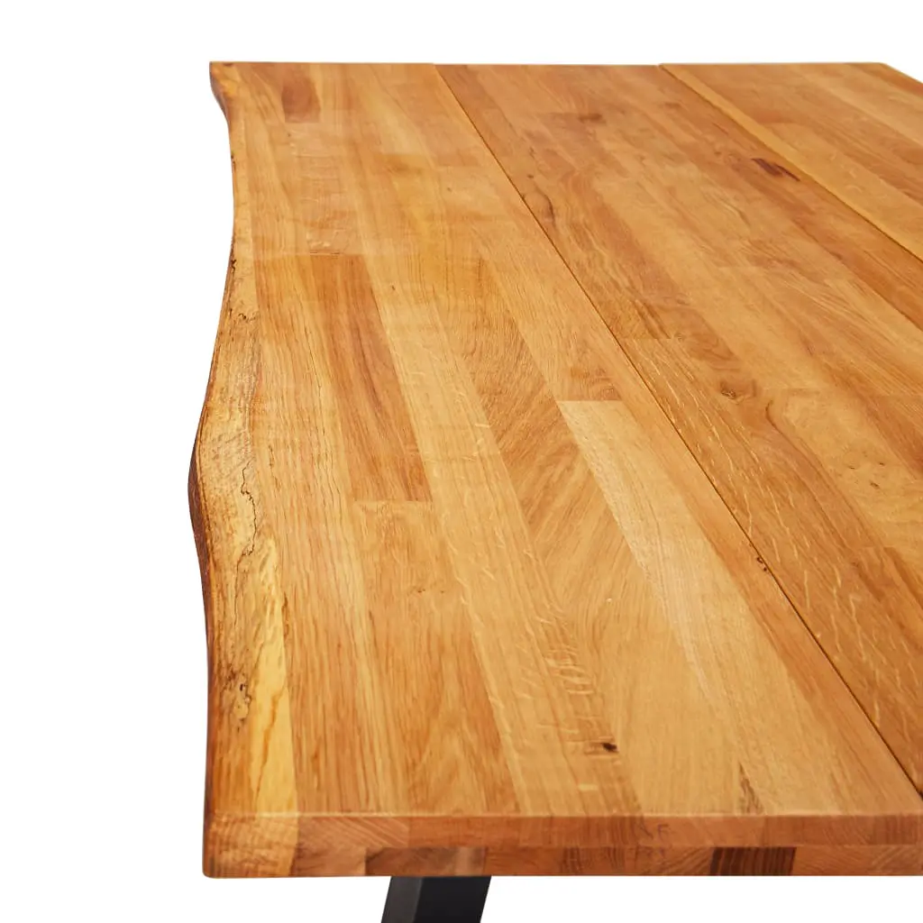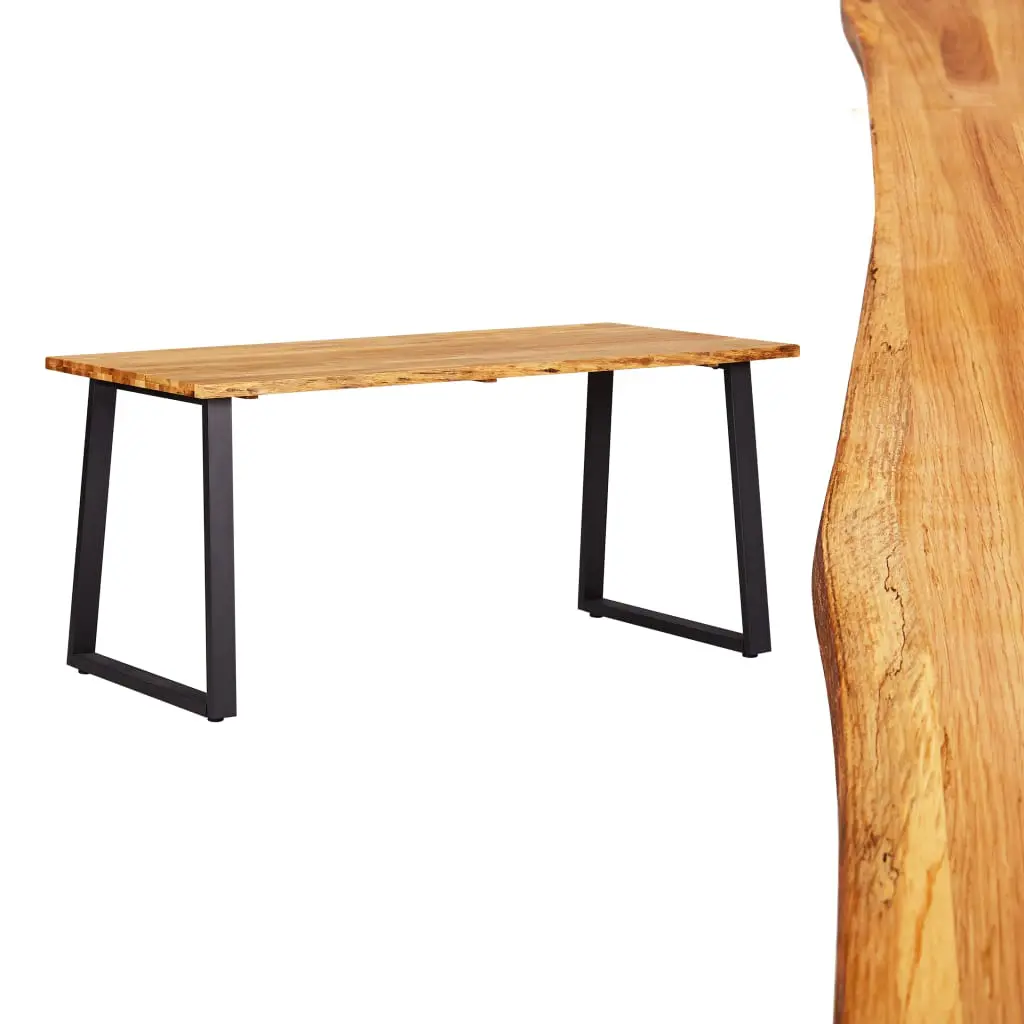 This solid wooden dining table is characterized by a cool, industrial style, which will make a great addition to your dining room or kitchen. The dining table is very sturdy and durable. The tabletop is made of solid oak wood, which is very durable. The wood’s live edge that follows the natural shape of the tree increases the beauty of the table. The unique, U-shaped, powder-coated metal legs add to the industrial style and make the table very stable. This item is easy to assemble. Please note that wood is a natural product and can show imperfections.